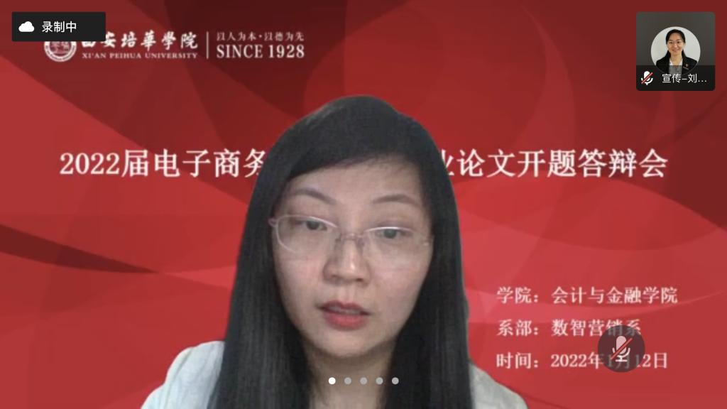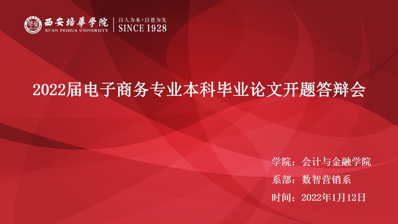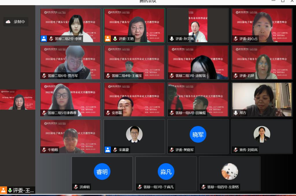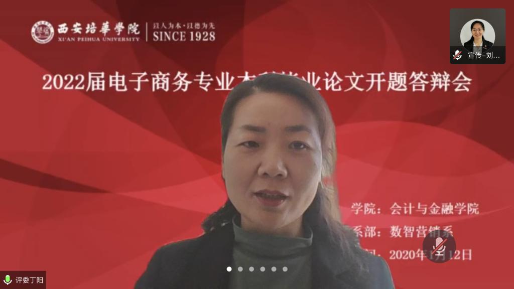 根据学校《关于做好2022届本科毕业论文(设计)开题工作的通知》(培华教函〔2021〕134号), 电子商务专业于2022年1月12日下午14:30——20:30在腾讯会议举办“2022届电子商务专业本科毕业论文开题答辩会”。本次开题答辩会分两组进行,每组答辩学生6名,答辩组长1名,答辩评委3名,答辩秘书1名,共计6个小时圆满的完成了2022届电子商务专业的开题答辩工作。