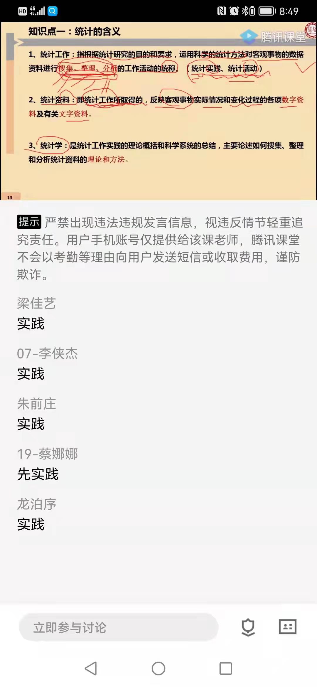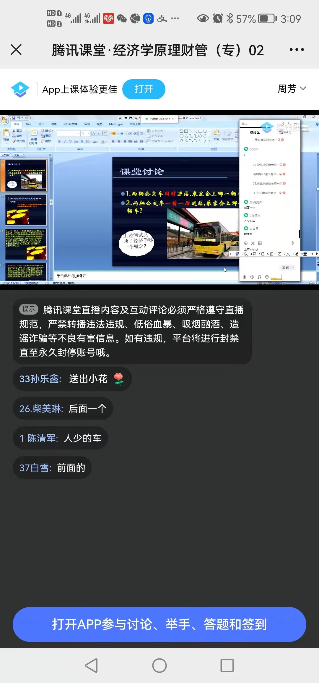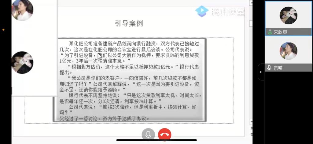 楚文静老师上课中全程开启摄像头,亲切面对学生。严格要求学生上课记笔记、端坐听讲,同宿舍之间互相监督。全程通过简短练习题和学生进行互动,考查学生本届知识点掌握情况。楚老师网络课堂生动有趣,对于公司金融、财经信息的讲解极大地调动了学生学习的积极性。