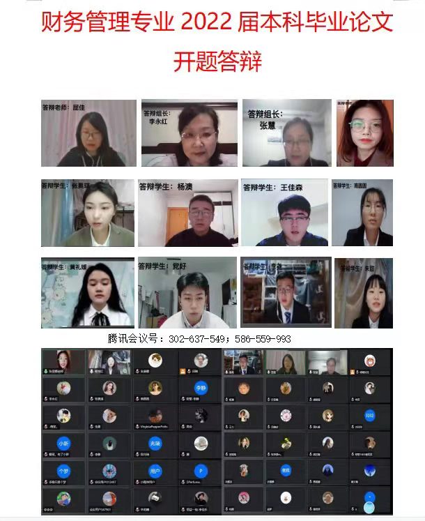 “省一流”财管专业2022届毕业论文开题报告云端答辩在1月7日九点分两组率先展开,从前期答辩计划安排、学生准备答辩资料,专业全体辅导老师呕心沥血,两位学院督导担任答辩组长,确保答辩顺利进行。