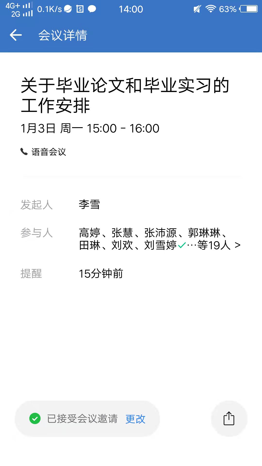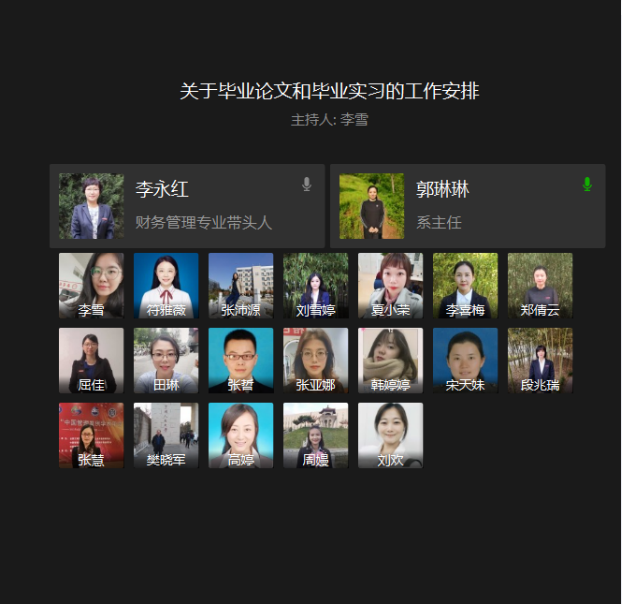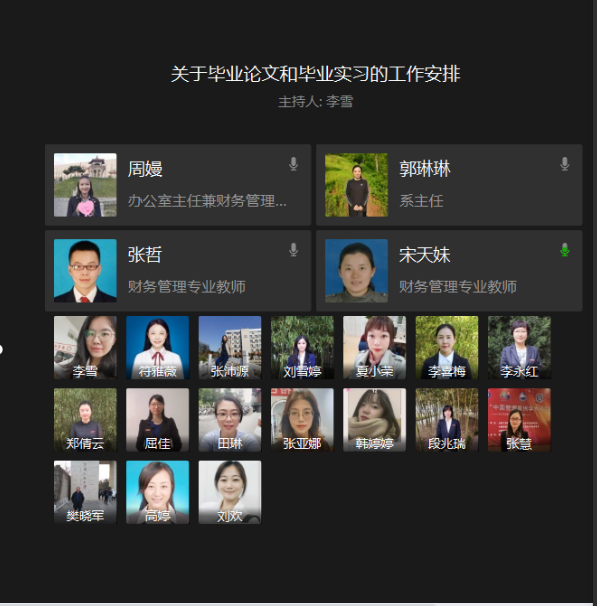 会议开始,郭琳琳老师首先传达了学校近期统一的工作安排和要求,然后对财务管理专业的各项工作如何开展进行了明确的分工,落实到人。其次,由于今年的论文工作新增了一项开题答辩的环节,且开题报告的内容也较往年有了较大的调整,大家在指导的过程中遇到很多问题,负责分管财管专业毕业论文的张亚娜老师和田琳老师分别对近期的论文开题工作进行了详细的安排,并对各位老师在论文指导工作中遇到的问题和困难进行了答疑解惑。最后,分管实习的宋天妹、张哲老师就本届毕业生的实习工作安排向大家做了汇报,并就一些细节问题在线上与办公室主任周嫚老师进行了有效沟通。