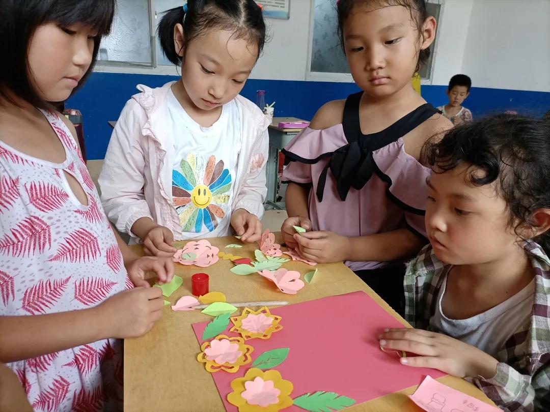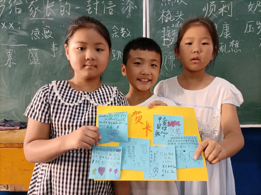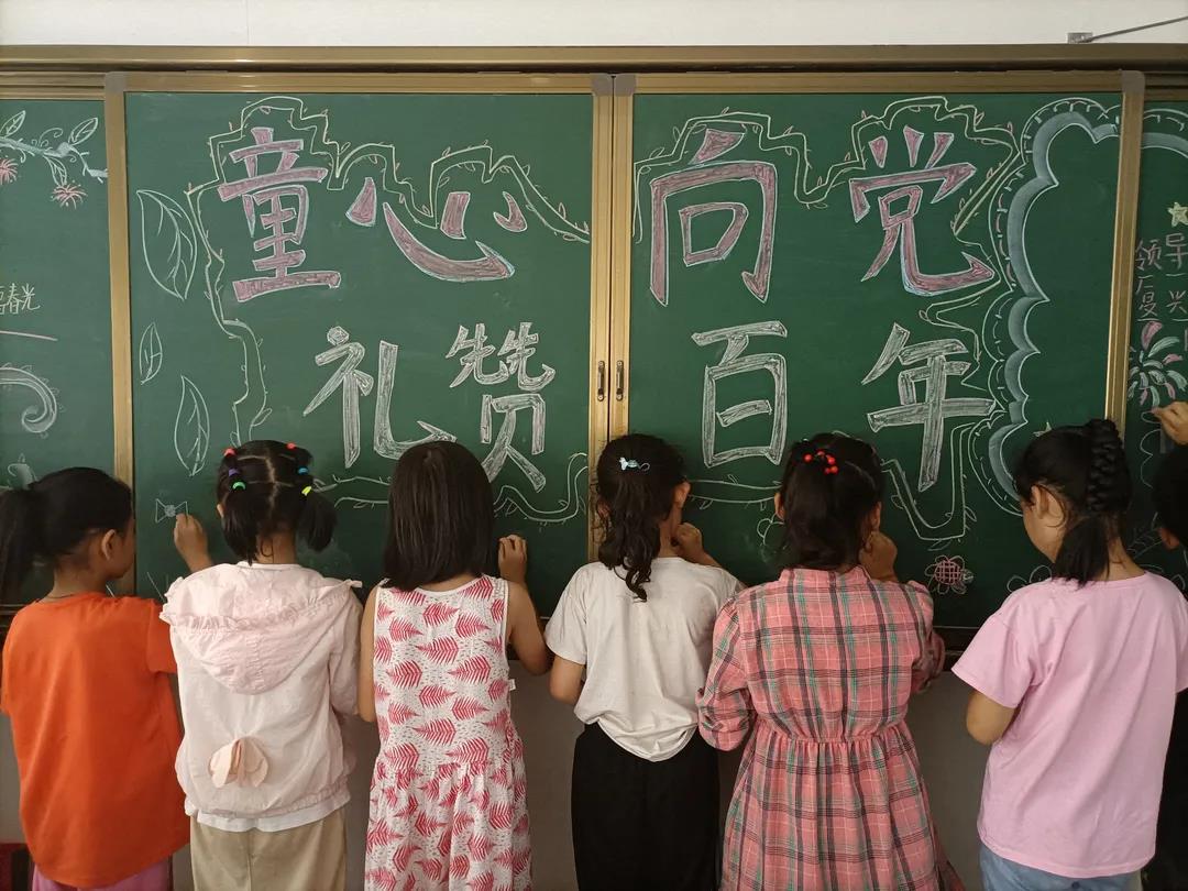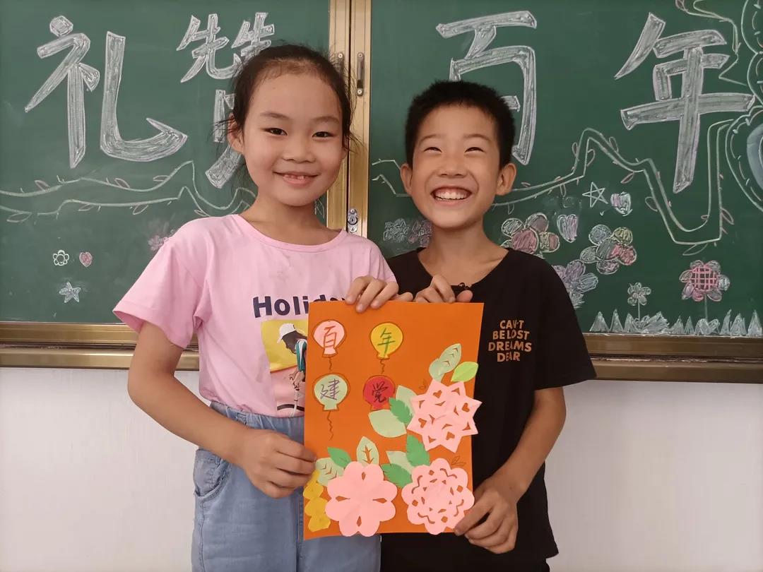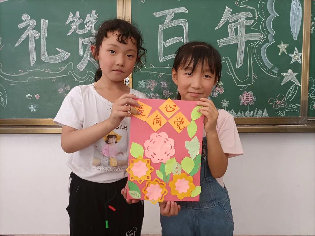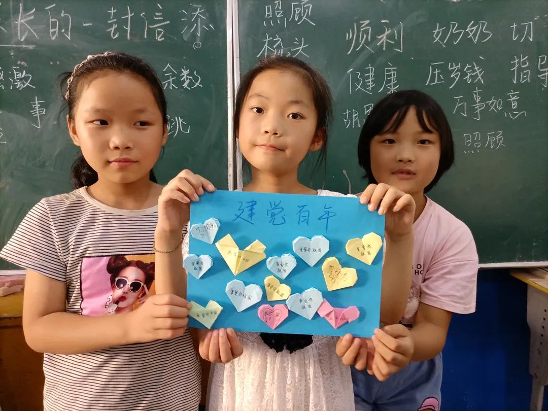 听完红色故事,孩子们也在志愿服务队成员们的带领下进行了黑板报和手抄报的绘制,并且制作了精美的手工作品。将党旗、天安门、祥云、锦鲤等绘画成一幅幅生动的手抄报,以此表达对祖国的爱意,并在爱心折纸上书写下建党百年祝福话语。让我们一睹他们的风采吧!