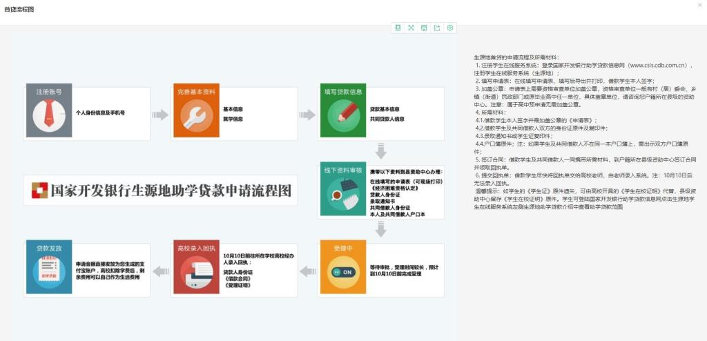 1.首次申请生源地信用助学贷款的学生要参加预申请。预申请学生先填写《家庭经济困难学生认定表》(附件1),并登录国家开发银行在线服务系统在线注册申请(网址为:https://sls.cdb.com.cn),填写个人基本信息和申请信息,携带打印好的《生源地信用助学贷款申请表》,到县(区)学生资助管理中心办理相关手续。首贷流程及所需材料如下图: