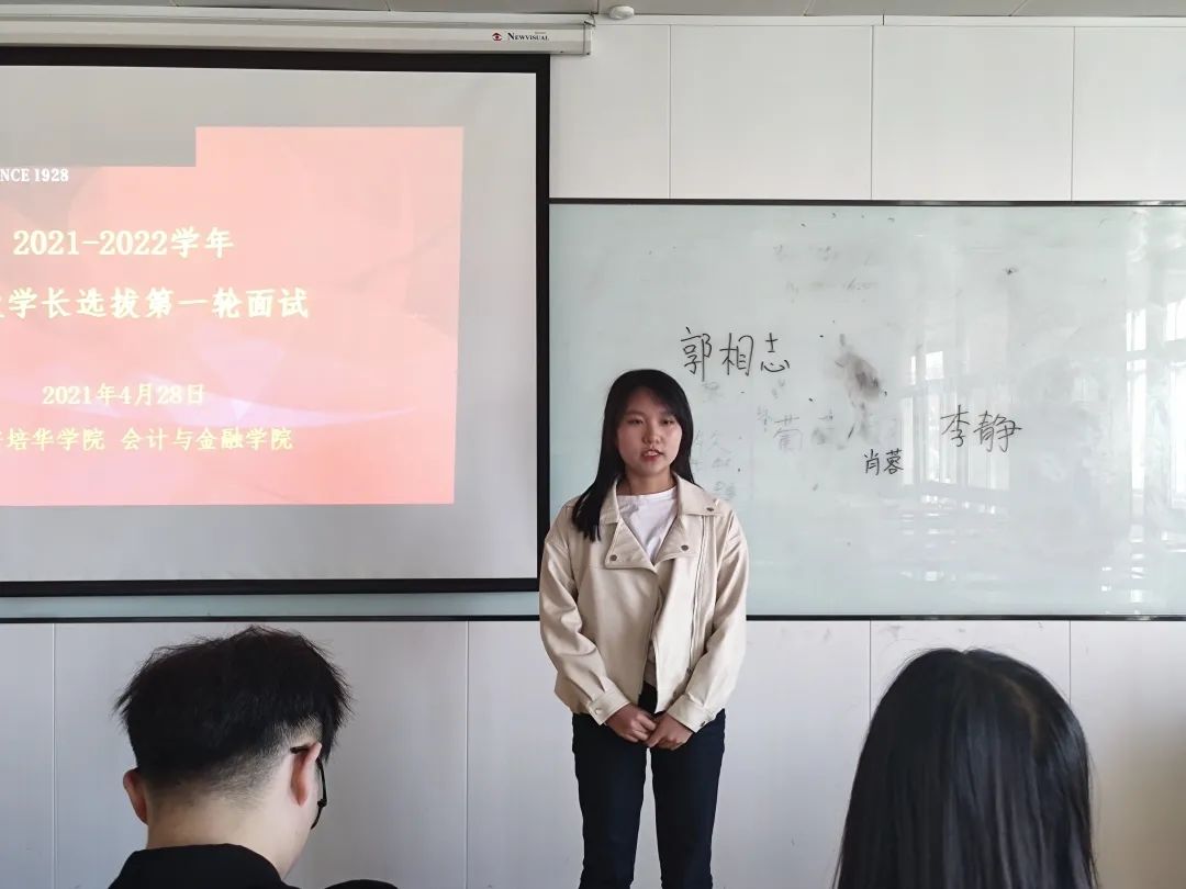 我院2021级班级学长选拔工作于3月20日正式启动第一阶段报名,共吸引19级、20级同学85人报名。74人成功进入第一轮面试。4月27—28日下午6:10在博远楼2516、2518、2519教室进行第一次面试,56人成功进入第二轮。