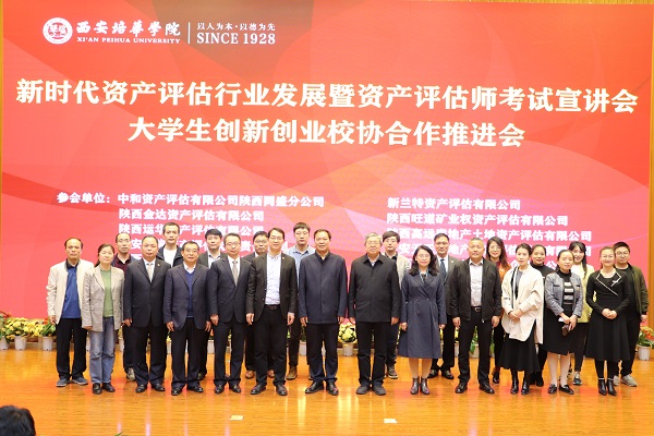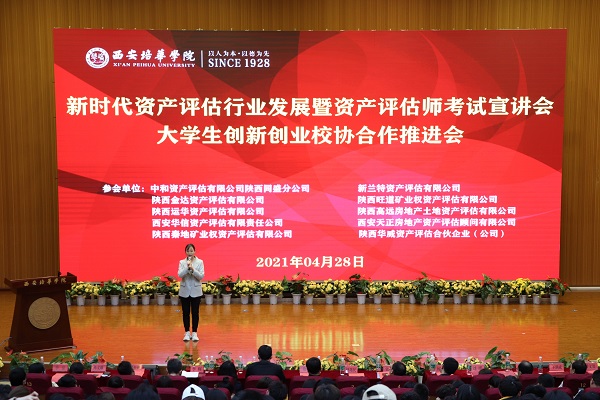 2021年4月28日,一个雨后初晴春光明媚的日子,西安培华学院图书馆报告厅迎来了“新时代资产评估行业发展创新创业校企合作”盛会,陕西省资产评估协会领导、十大评估公司总经理与会计与金融学院师生欢聚于此,探索加强学院产学研工作,深化校协合作交流,拓展学院“双师型”教师的培养路径,实现“育训结合、书证结合”的应用技术型人才培养模式。