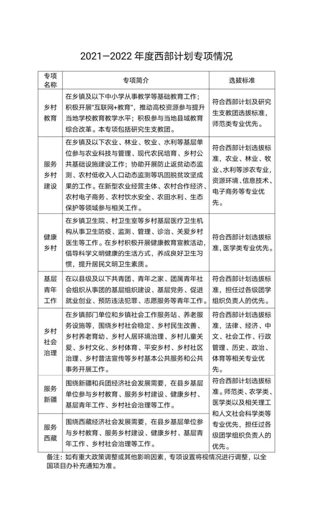 2020—2021年度,由中央财政支持,面向普通高等学校(教育部《全国普通高校名单》所列高校)应届毕业生或在读研究生,按照公开招募、自愿报名、组织选拔、集中派遣的方式,招募选派一定数量的西部计划全国项目志愿者到西部地区基层工作(含已招募的第二十二届中国青年志愿者扶贫接力计划研究生支教团志愿者)。西部计划的服务内容分为基础教育、服务三农、医疗卫生、基层青年工作、基层社会管理、服务新疆、服务西藏7个专项,志愿者服务期为1至3年,服务协议一年一签。