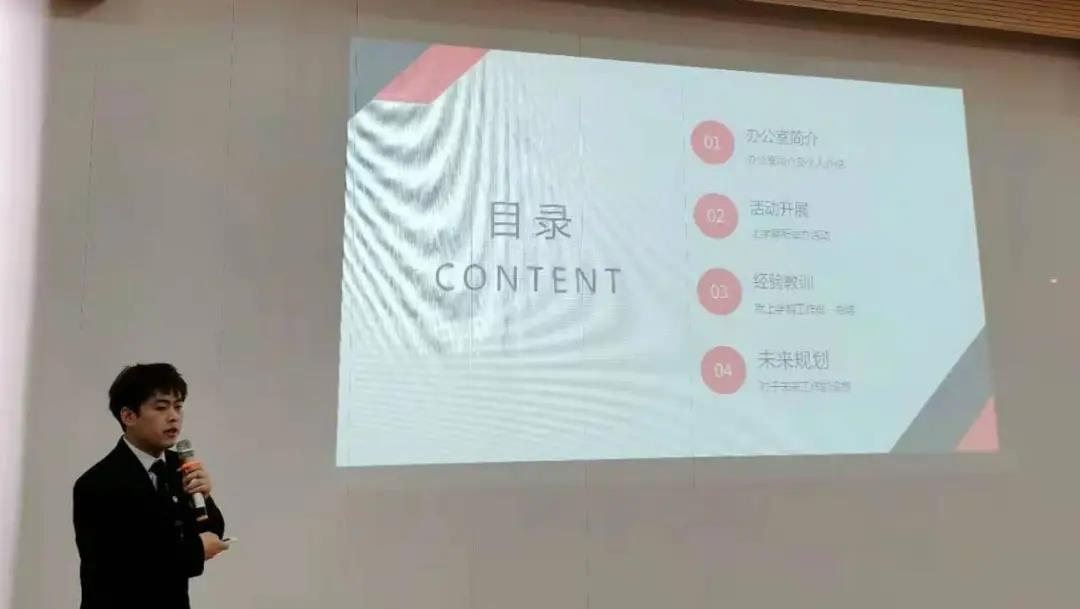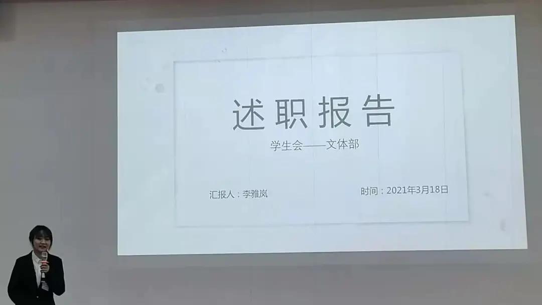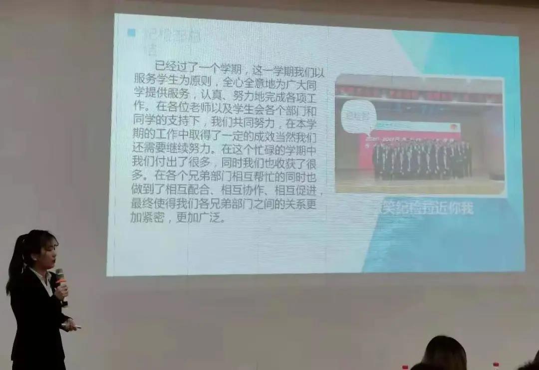 各部门部长依次发言,通过PPT对本部门一学期的工作做出概述,总结了工作上的得失,并结合自身部门特点,向在场成员传授了宝贵的工作经验。