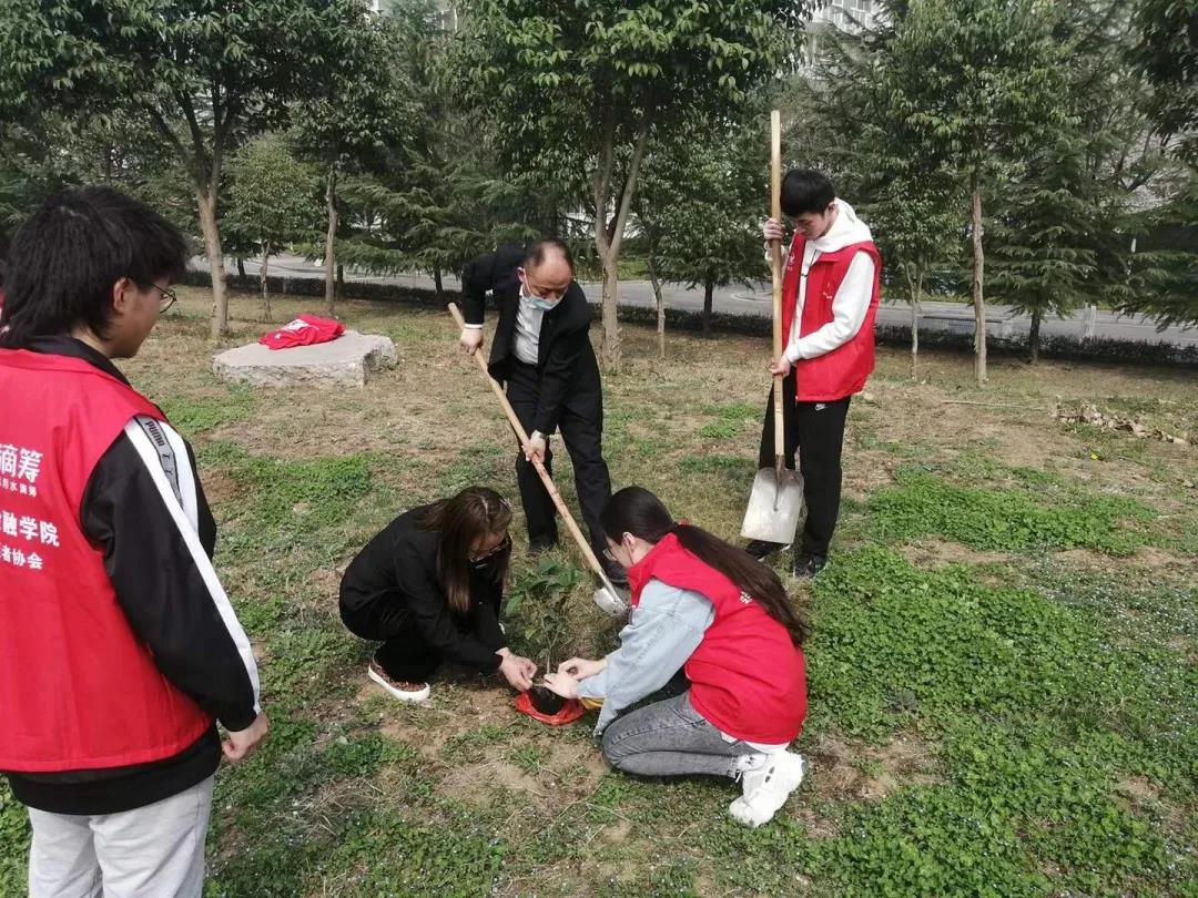 在阳光的照耀下,植树活动热烈展开。志愿者们与老师们分成几组,相继参与到植树工作中,或用铁锹铲土,或帮助固定小树。志愿者们在小树的周围覆起一个环形土堆,再在坑中浇上净水。随着最后一寸土壤被压实,在所有参与者的共同努力下,小树扎根草地,增添片片新绿,萌生点点春意。