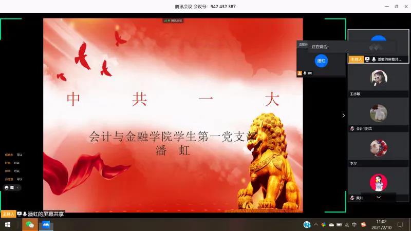 百年潮 正青春2020/跟/我/一/起/读/党/史/2021年是中国共产党成立100周年。中国共产党的成立,是开天辟地的大事变,深刻改变了近代以后中华民族发展的方向和进程,深刻改变了中国人民和中华民族的前途和命运,深刻改变了世界发展的趋势和格局。为庆祝中国共产党建党100周年,进一步坚定党员同志在中国共产党领导下走中国特色社会主义的信念,加强“四史”学习教育,重温百年党史,会计与金融学院党委开展了“百年潮,正青春”系列活动之“跟我一起读党史”。本次活动由各党支部自主选题,可围绕中国共产党成立100周年以来的重要事件、历史物件、红色足迹、党员心声等四方面开展读党史活动,深入学习一百年来党的光辉历程和宝贵经验。2021年2月10日会计与金融学院学生第一党支部潘虹同学以“中共一大”为主线展开了他的“党史阅读”。