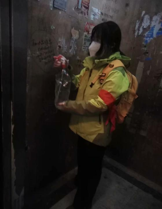 马丹婷同学,从1月25日进入工作岗位,每天从早上8点到晚上12点,与其他志愿者分四班轮流值守,主要负责疫情排查防疫宣传和路口值守,以及小区内部电梯、楼道的消毒。她说:“身为大学生,又是入党积极分子的她,理应积极响应党组织号召。为疫情防控奉献出自己的一份力量。”这便是她的动力。