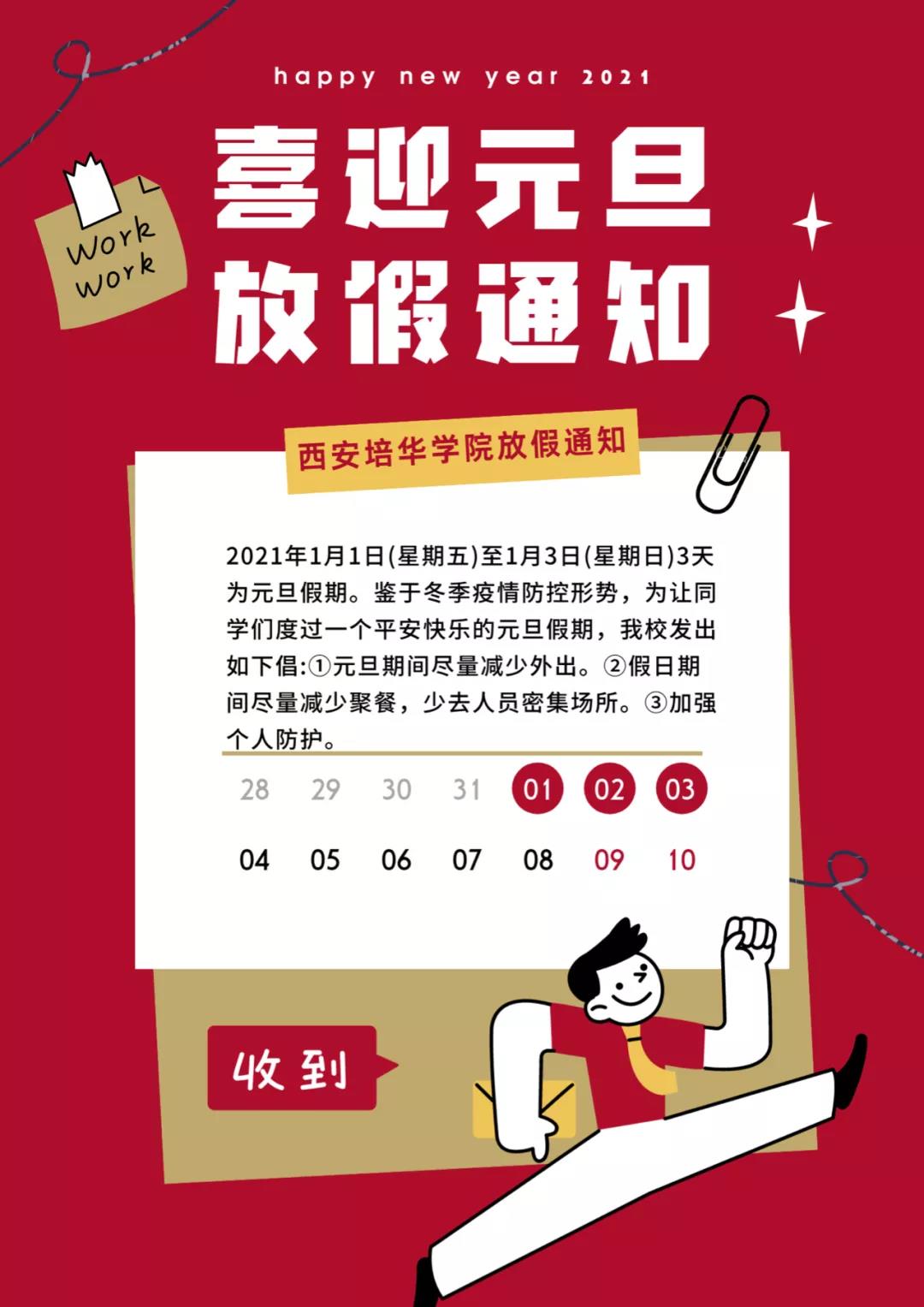 根据《国务院办公厅关于2021年部分节假日安排的通知》要求,2021年1月1日(星期五)至1月3日(星期日)3天为元旦假期。鉴于冬季疫情防控形势,为让同学们度过一个平安、祥和、安全、快乐的元旦假期,结合我校实际情况,现向全校全体同学发出如下倡议: