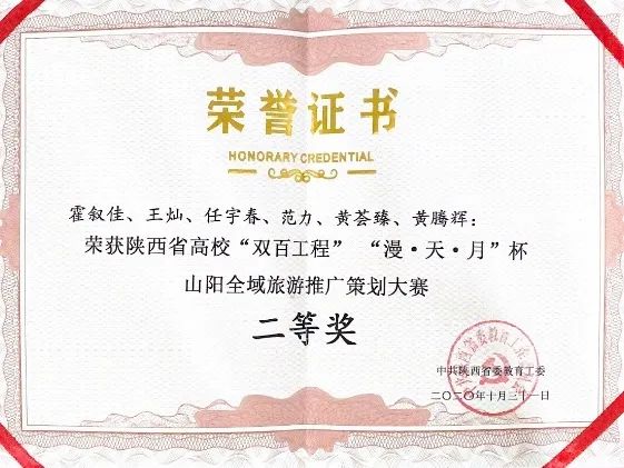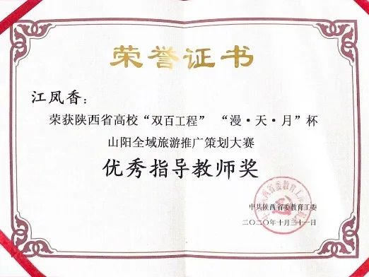 我院学子在“漫·天·月杯”山阳旅游推广大赛中荣获二等奖,黄荟臻和任宇春同学获聘山阳县旅游形象大使称号,江凤香老师荣获“优秀指导教师”称号。