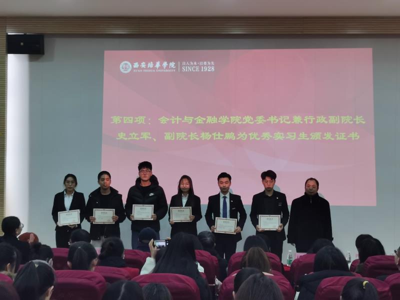 大会第四项,由会计与金融学院副院长杨仕鹏和院长助理韩建军给优秀实习生颁发证书。