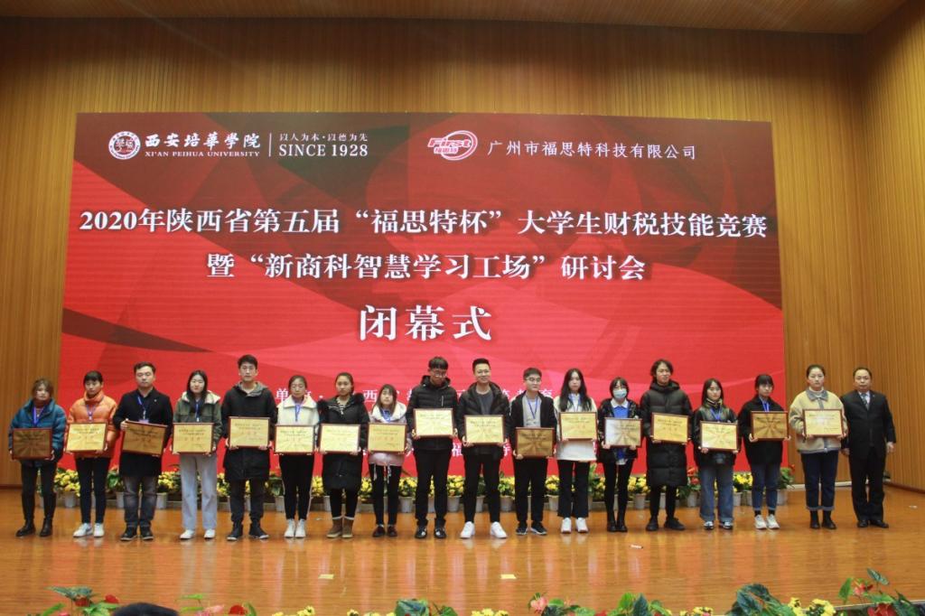 西安外国语大学审计处处长乔引花、西安石油大学经济与管理学院院长王君萍、西安财经大学商学院教授赵栓文、西安邮电大学经济与管理学院副院长苏锦旗、安康学院经济与管理学院副院长李勇、西安培华学院会计与金融学院副院长杨仕鹏、西安培华学院会计与金融学院副院长孙文琳、广州市福思特科技有限公司总经理杨帆等嘉宾为获奖选手、优秀指导教师和优秀组织单位颁发奖牌和证书。