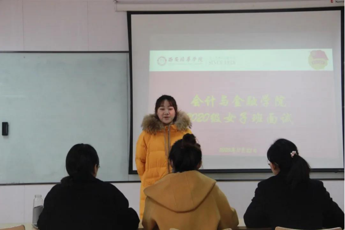 为积极弘扬女性教育精神,培养女性的综合素质,打造女性教育品牌,会计与金融学院2020级女子班面试,于11月25日在博远楼2210~2213教室进行。本次面试分为三组,共有29名大一新生参加。负责此次面试的老师有:张梅、王苗鑫、李青、刘湘辰、张忠清、杨玉春、南洋、张妍、张羽晗。