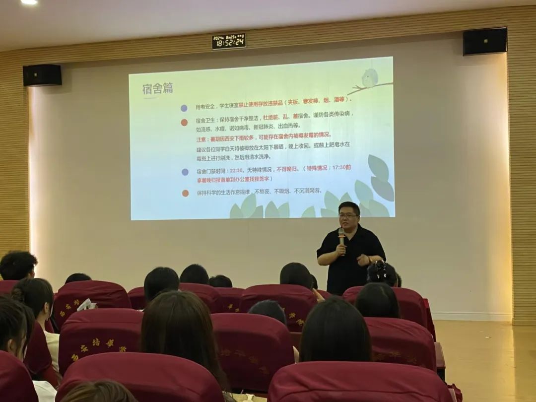 然后,在健康生活及安全教育环节,班会围绕消防安全、用电安全、心理情感等多个方面进行了深入讲解。特别强调了学生寝室的防火防电安全教育,以及网络意识形态安全的重要性。通过实际案例和法律知识的普及,引导学生树立自护自救观念,增强安全防范意识。同时,针对新学期可能出现的传染病问题,班会也提出了具体的预防措施和建议。