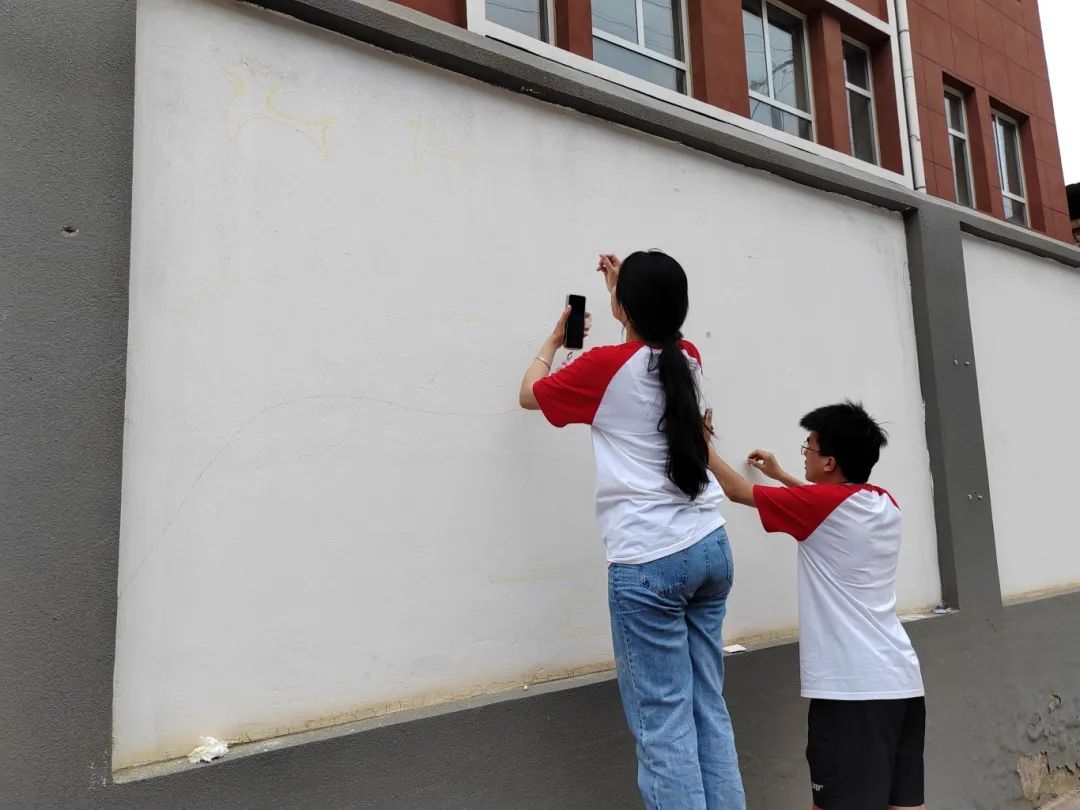 队员们对村内需要绘画的墙面进行调查并将要绘制的墙体特色、环境及数量进行规划统计。队员们从调色、绘制残缺底稿到涂色,相互配合,乐在其中。