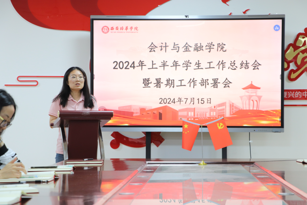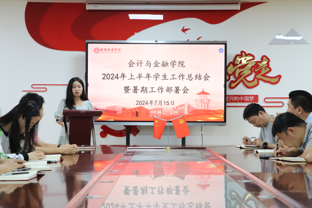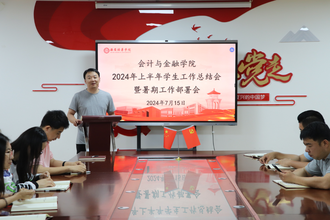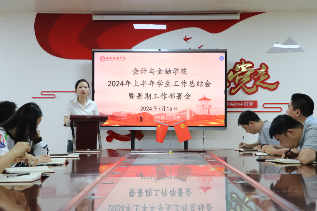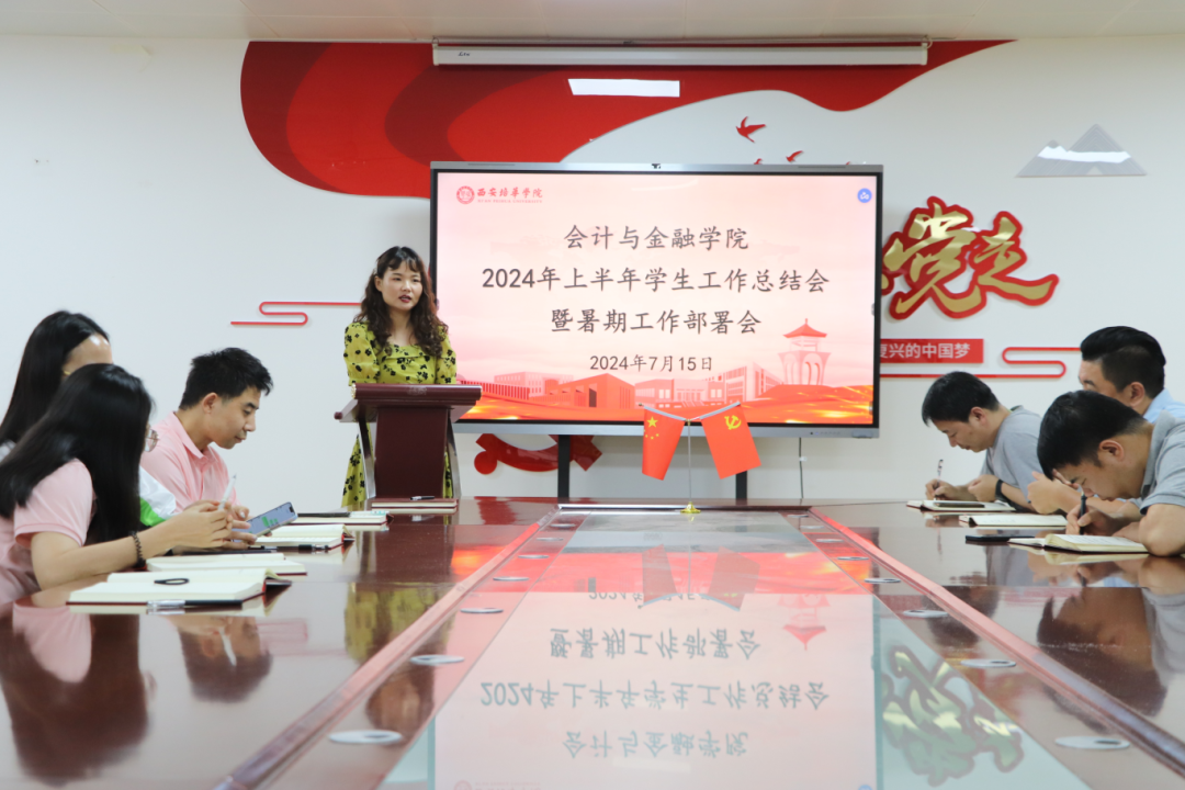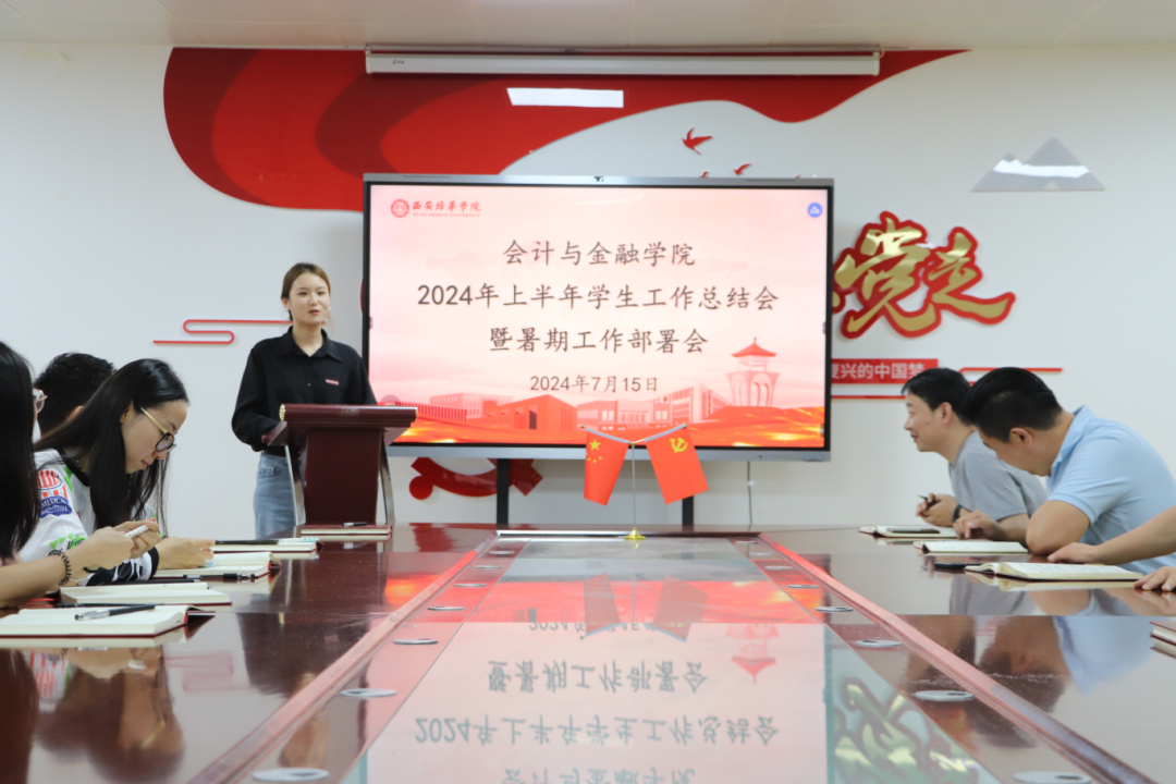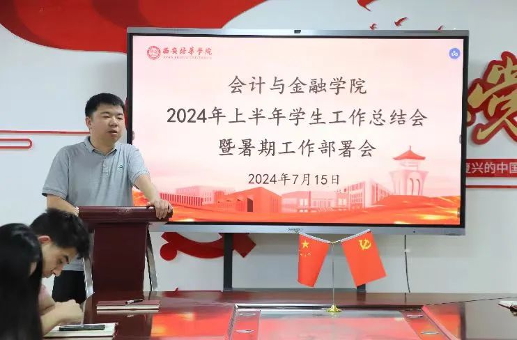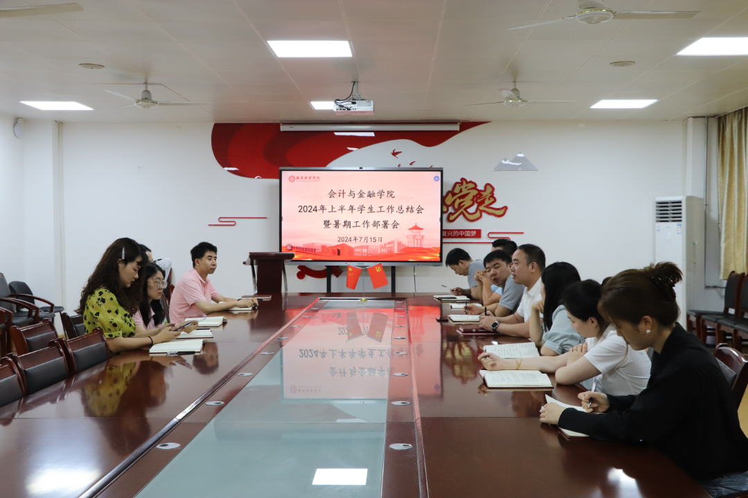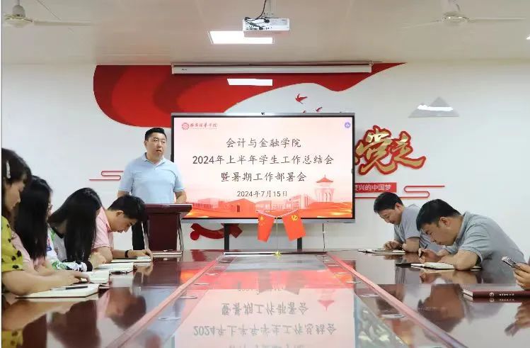 2024 年 7 月 15 日下午 16 点,会计与金融学院于 2115 会议室隆重召开了 2024 年上半年学生工作总结会暨暑期工作部署会。此次会议意义重大,旨在回顾过去半年的工作成果,总结经验教训,并为即将到来的暑期工作做好全面规划和部署。参会人员包括会计与金融学院党委书记兼行政副院长刘斌、党委副书记高乐,以及全体辅导员。