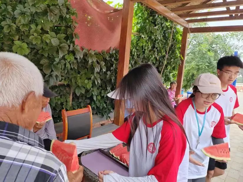 走进敬老院,开展尊老、敬老、爱老、助老服务活动。社会实践团队成员向敬老院的老人们买了西瓜等水果,切好西瓜,与老人们围坐在一起,目光中闪烁着期待。每一片西瓜都晶莹剔透,汁水丰富。“真甜啊!”一位老人品尝后赞不绝口。他的脸上洋溢着满足和幸福的笑容。这一刻,西瓜不仅仅是一种水果,更是老人们心中的一份关爱和温暖。老人们津津有味地品尝着西瓜,在这个充满爱的养老院里,每一个小小的细节都显得如此温馨和美好。