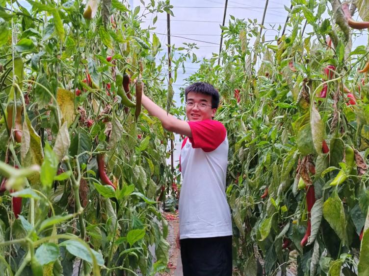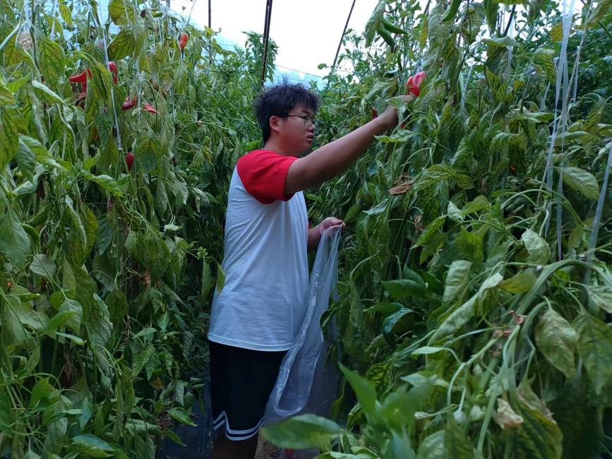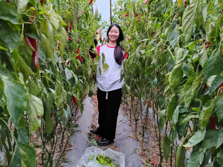 队员们的到来受到了村民的热忱欢迎,勤劳地在大棚中往来穿梭,跟着菜农一同采摘辣椒。起初采摘农作物的时候,队员对于农作物的辨别以及采摘的方法还不太明晰,但团队成员在旁边村民耐心地解说下,他们慢慢地变得熟练起来。