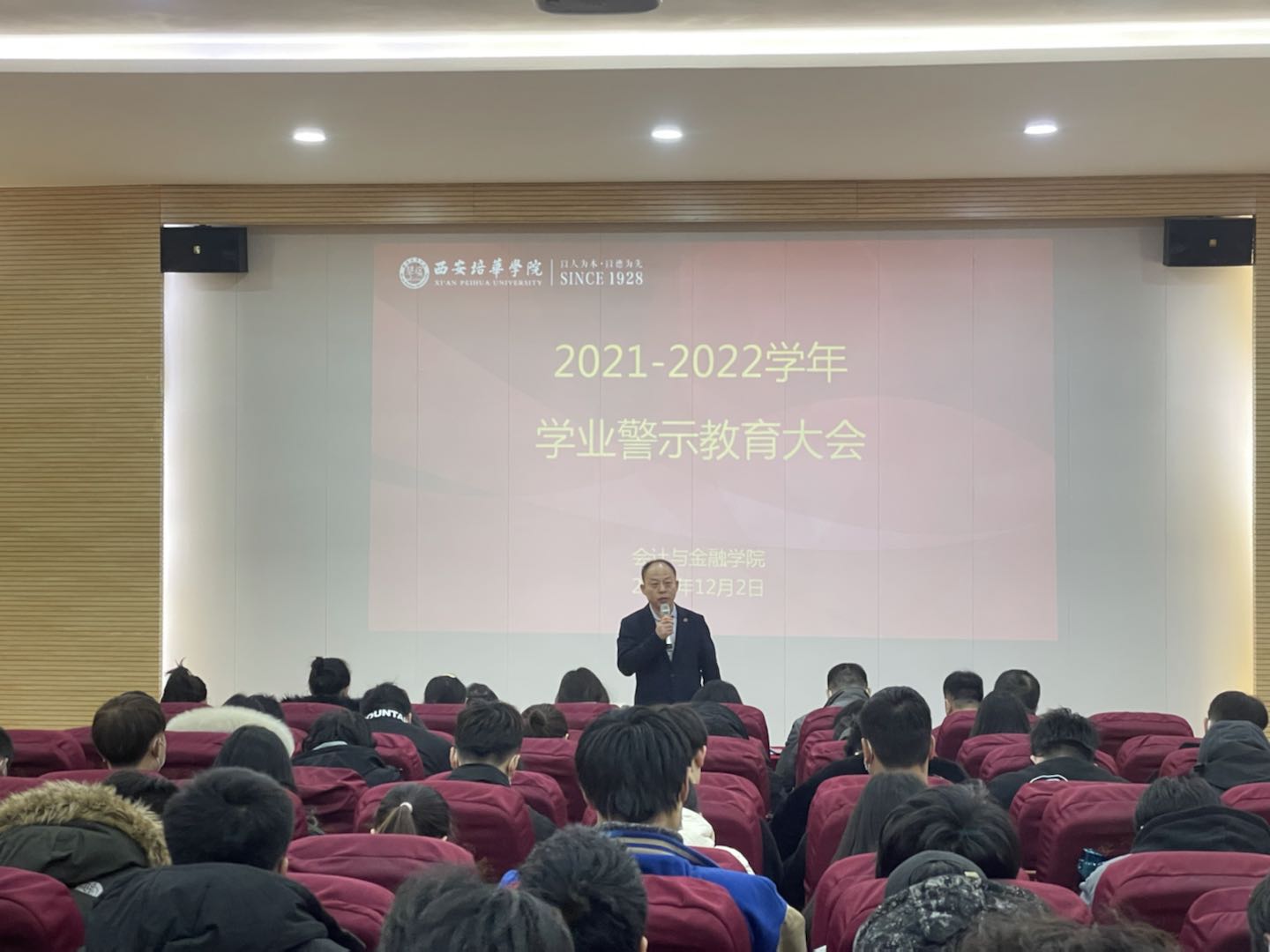 12月2日,为了进一步加强学风建设和学生学业管理,推动形成学校教育和家庭教育合力,警示、督促和帮助学业存在问题的学生及时转变学习态度,改善学习方法,不断提升自身学习效率和学习质量,会计与金融学院召开2021-2022年度学业警示教育大会。本次参会人员有,杨仕鹏副院长,史立军副院长,韩斌副书记,各专业负责人;辅导员以及学业导师;学生干事;红色、橙色预警等级学生。