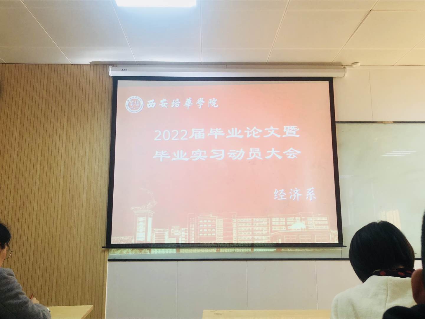 根据西安培华学院教务管理中心下发《西安培华学院关于 2022届本科毕业论文(设计)工作的安排通知》(培华教函〔2021〕84号)的文件精神,按照《西安培华学院本科毕业论文(设计)工作管理办法》(修订稿)相关规定,为确保国际经济与贸易专业、金融工程专业毕业论文工作的顺利进行,保证并提高毕业生的毕业论文质量,经济系于2021年11月24日在2315教室就2022届本科毕业论文(设计)工作向指导教师及全体国贸、金融工程专业毕业生召开动员大会。