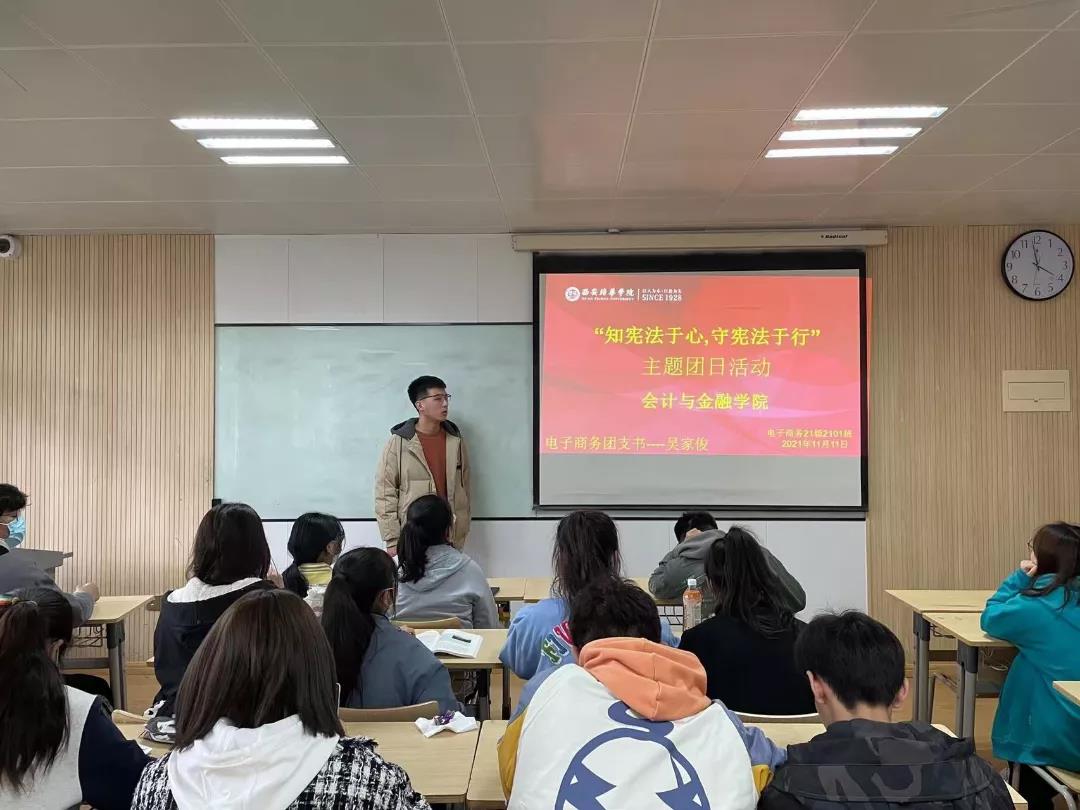 为深入开展青年大学习,宪法学习宣传,坚持以社会主义核心价值观为引领,以爱国主义教育为重点,紧密结合历史文化和国情,进一步普及宪法知识,弘扬宪法精神。会计与金融学院团委于2021年10月11日~11月15日积极引导各团支部2021年度“知宪法于心,守宪法于行”的团日活动。