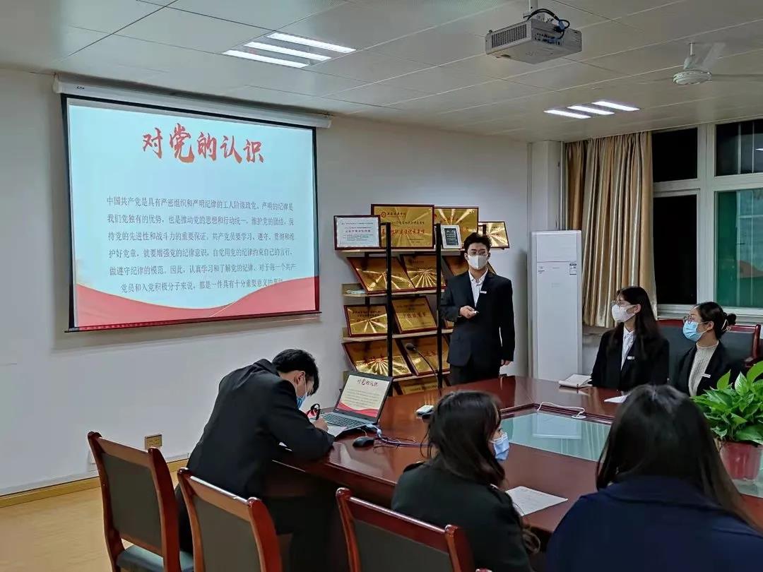 各学生党支部先由拟发展对象进行自我介绍,采用PPT的形式,从考察期间个人思想政治、工作学习、示范带头作用等方面汇报自己的情况。所有拟发展对象进行完自我陈述后,与会支部书记和党员同志对拟发展对象进行现场提问,答辩者进行现场回答。