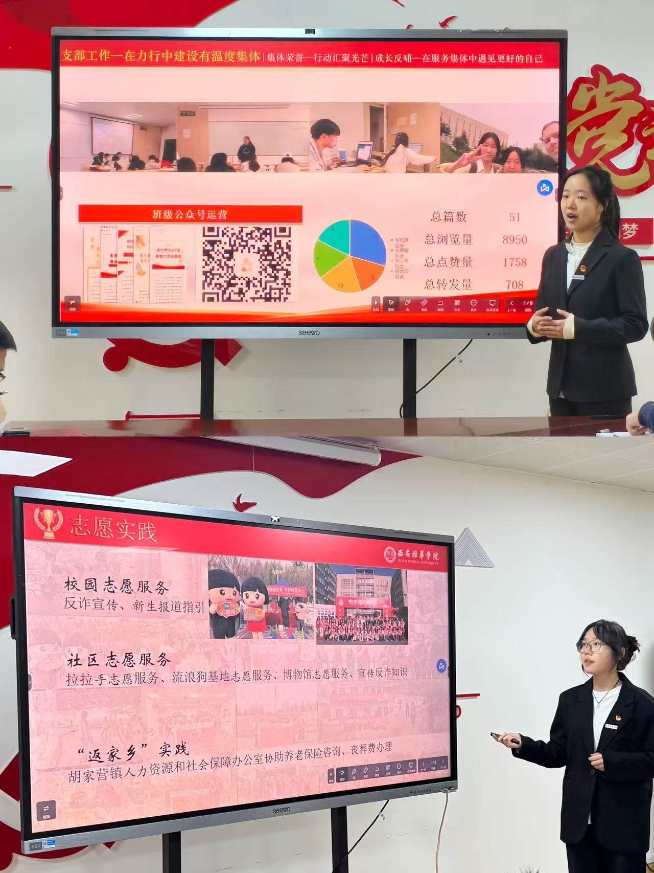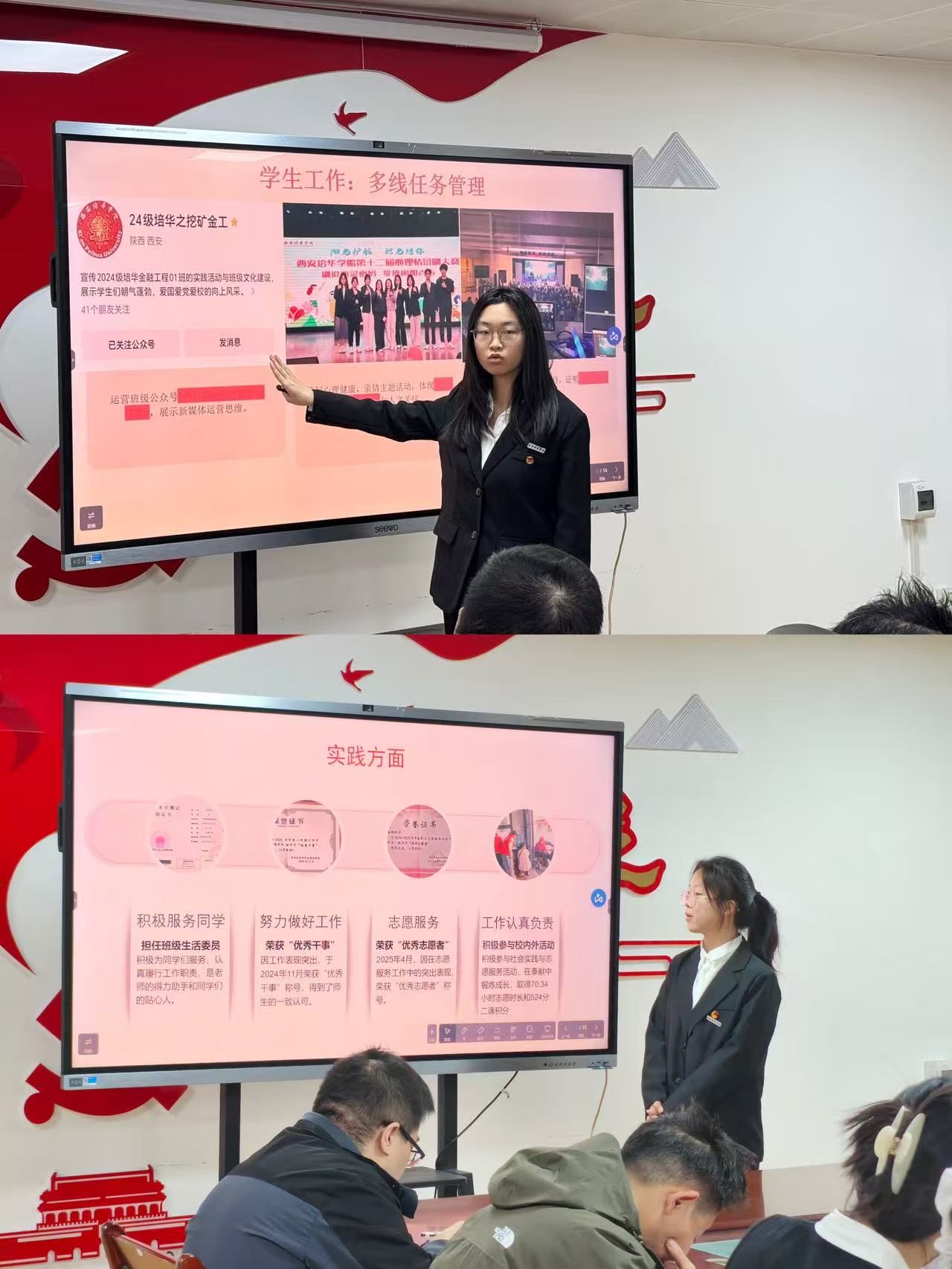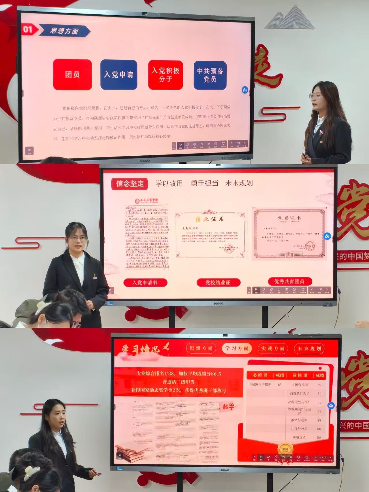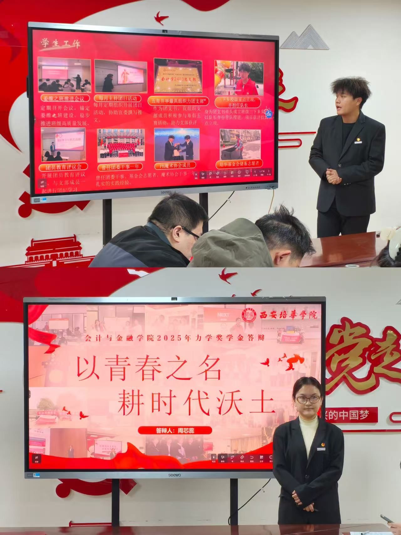本次评审会严格把控答辩时间与现场纪律,流程规范、组织有序。参与答辩的学生在规定时间内,结合准备的PPT逐一进行展示,分别从学业成绩、科研创新、社会实践、志愿服务、综合素质及个人成长经历等方面展开陈述,全面而生动地展现了自身的突出表现与奋斗历程。各位候选人的答辩内容充实、条理清晰,充分体现了会金学子扎实的专业素养、昂扬的精神风貌与不懈的奋斗姿态。