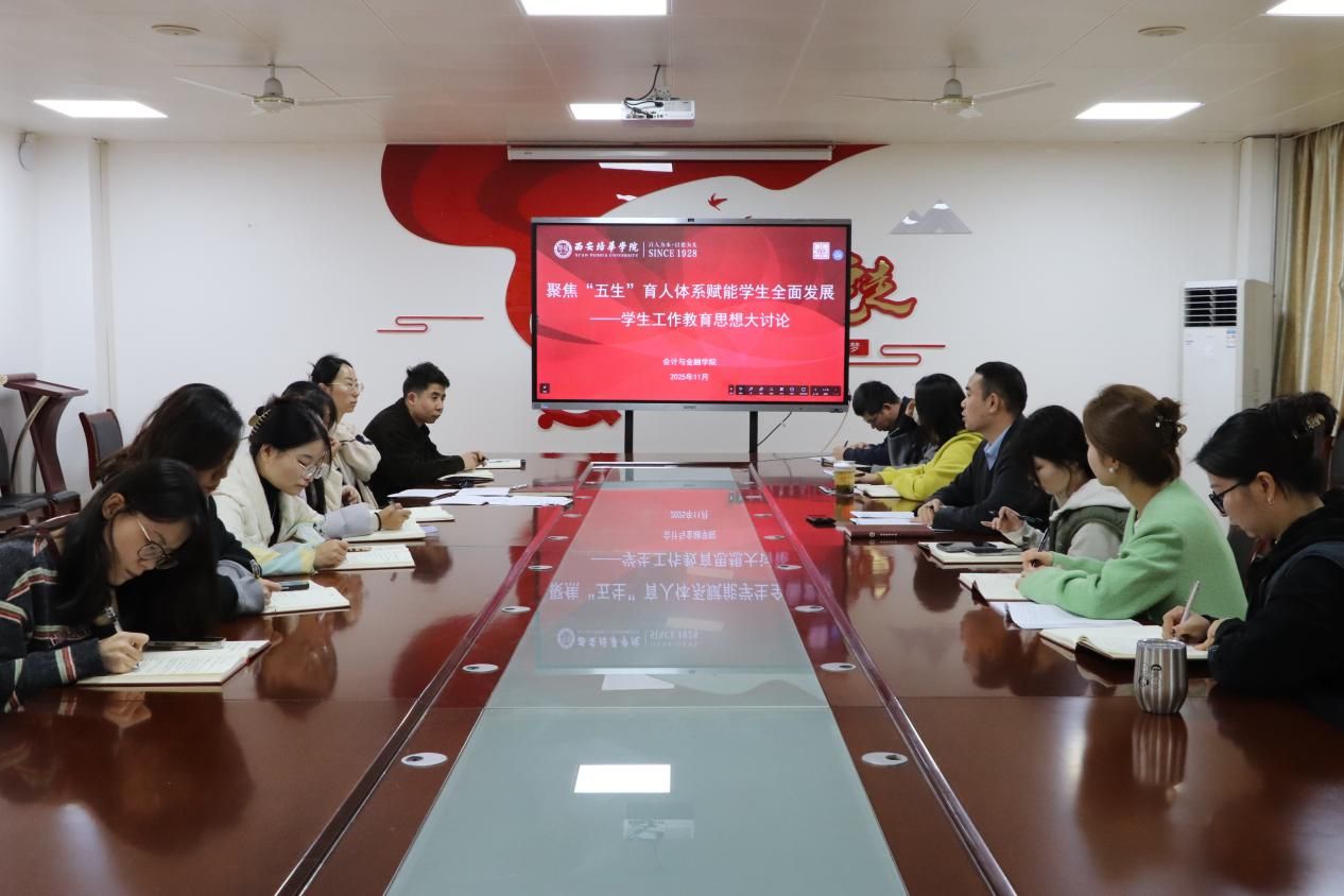 为深入贯彻落实立德树人根本任务,构建高质量学生育人体系,2025年11月5日上午9点,会计与金融学院在博远楼2115会议室隆重举行“聚焦‘五生’育人体系・赋能学生全面发展”学生工作教育思想大讨论。会计与金融学院党委书记兼行政副院长刘斌主持会议并发表讲话,全体辅导员老师参加此次讨论,共同为学院学生工作高质量发展建言献策。