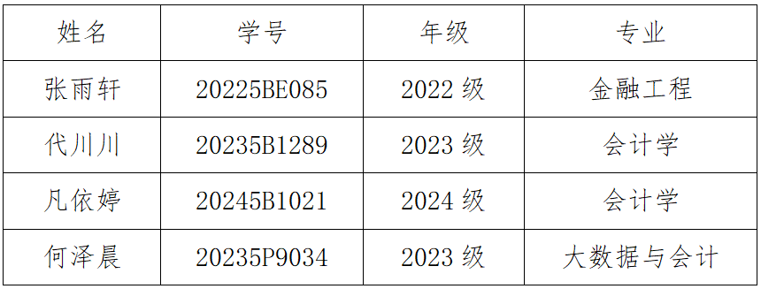 根据学校《关于开展2025年度“筑梦奖学金”评选的通知》以及《西安培华学院学生资助资金管理实施细则》的规定,我院严格按照公开、公平、公正的原则和程序,由学生本人提出申请,辅导员进行材料审核,并在此基础上,于2025年11月5日召开会计与金融学院2025年度筑梦奖学金联评会议,认真讨论了参评学生的情况。经学院严密组织,层层评议,现将评审结果公示如下: