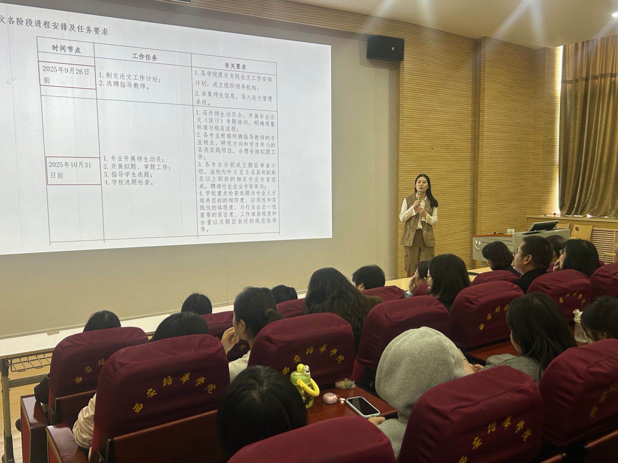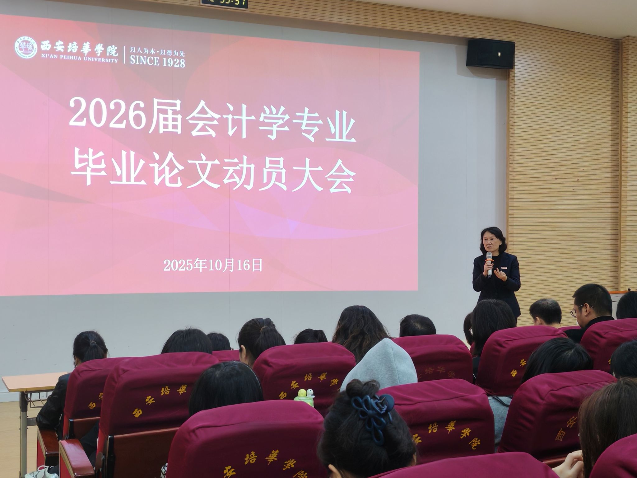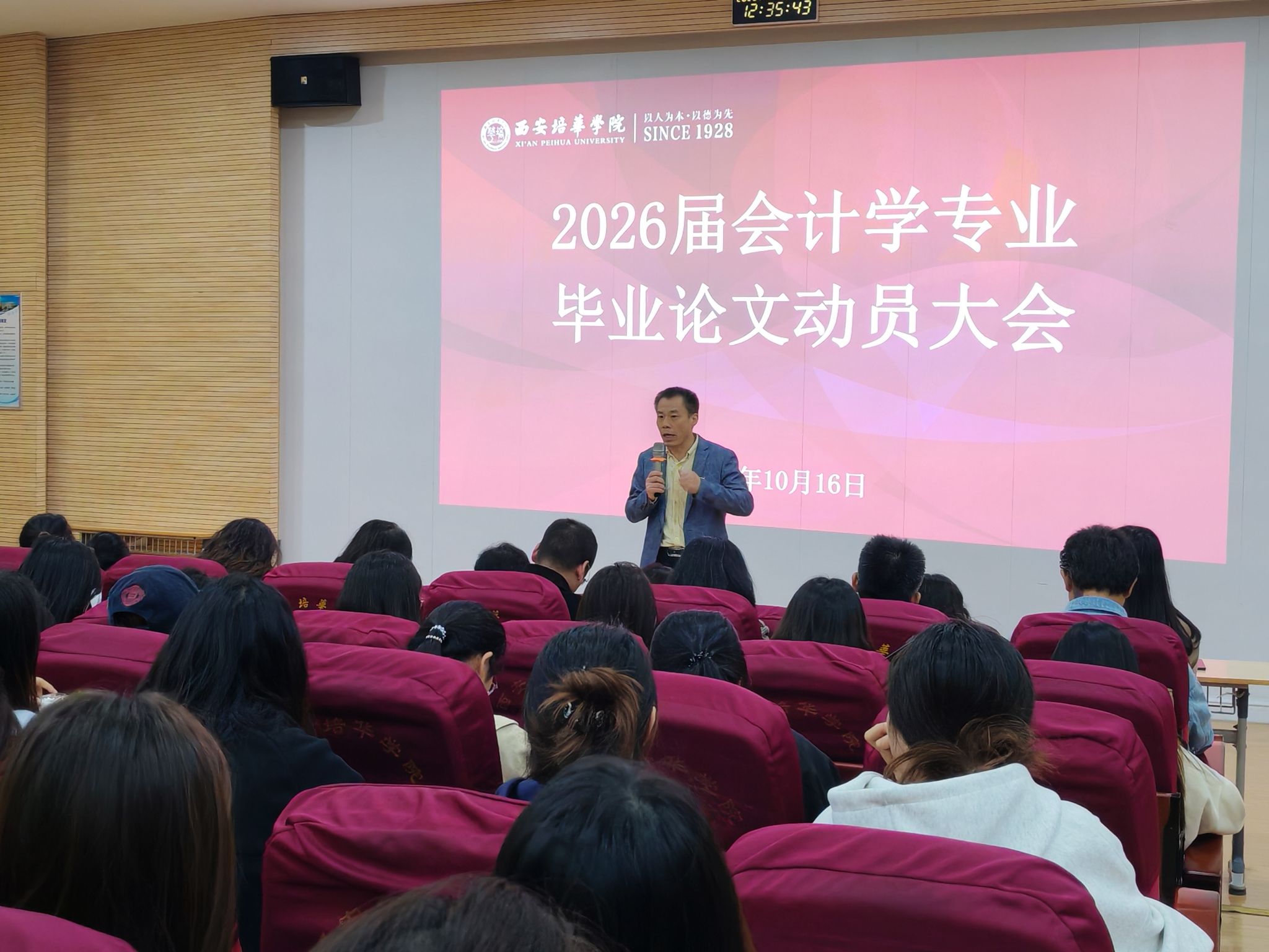 为深入贯彻落实学校审核评估工作要求,紧扣人才培养核心目标,依托国家级一流本科会计学专业建设优势,强化学术规范教育,明确毕业论文全流程要求,帮助2026届本科生平稳开启论文工作,2025年10月16日中午,西安培华学院会计与金融学院会计学系,在博远楼J201教室召开 2026届本科毕业论文动员大会。会议由会计学系主任王小毅教授主持,教学副院长孟君教授、专业带头人王珏教授、全体论文指导老师及2026届本科生参加了此次动员会。