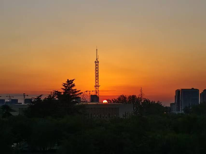 天空被夕阳晕染成从橙红到浅黄的渐变色彩,一座金属结构的信号塔矗立在画面中央,成为视觉焦点。远处的建筑与塔吊勾勒出校园周边的轮廓,近处的树木郁郁葱葱,在暮色中形成深绿的剪影。夕阳如一枚红火球,在建筑后方缓缓下沉,给整个校园蒙上了一层温暖而静谧的滤镜,既有校园的青春气息,又有自然日落的诗意浪漫,仿佛时间在此刻静止,满是治愈的氛围感。