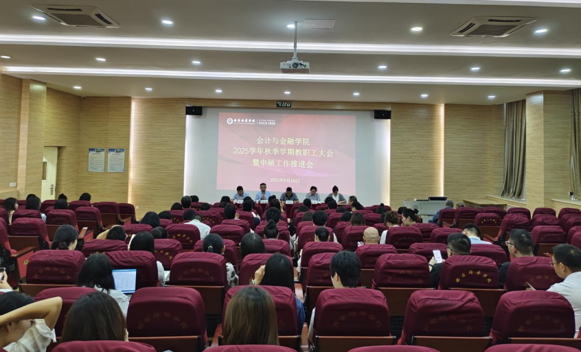2025年9月10日14时,会计与金融学院在J201教室召开全院教职工大会。院长吴旺延、党委书记兼行政副院长刘斌、副院长孟君、院长助理吴春娜及全体教职工参加会议。会议由刘斌副院长主持。
