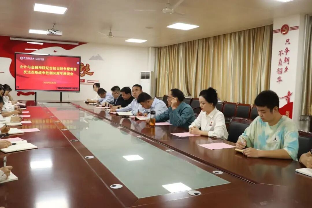 2025年9月3日上午,会计与金融学院在博远楼2115会议室举行纪念中国人民抗日战争暨世界反法西斯战争胜利80周年座谈会。学院党委委员、各支部书记及师生党员代表齐聚一堂,共同回望历史、缅怀先烈。党委书记兼行政副院长刘斌主持座谈。