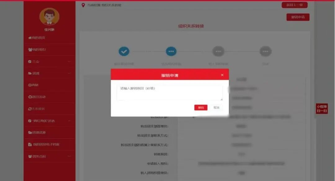 注:转接到各学院所在的新生团支部,切记不能直接转入校团委,否则无法准确二次分配。转到会计与金融学院团总支的同学撤销申请,再申请转入临时支部。
