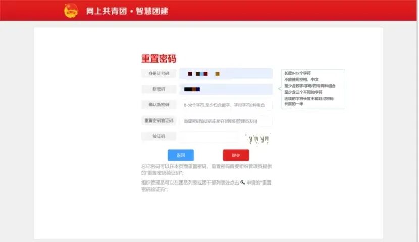 (1)若显示身份证或密码错误,请联系原高中确认本人是否已被录入“智慧团建”系统;若确认在系统内,可让本级或直属上级团支部管理员生成密码重置码,拿到重置码后,打开系统首页,选择“忘记密码”,按照页面提示操作即可。