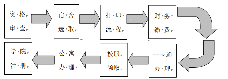 1.资格审查:新生到校后,接待人员引导新生到迎新现场(新生报到处)审核新生入学资格并领取报到流程表;