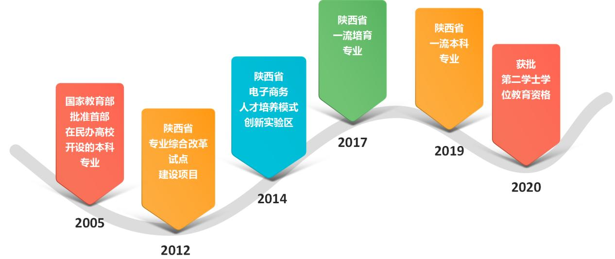 电子商务专业是2005年经国家教育部批准首批在民办高校开设的本科专业,2012年获得陕西省专业综合改革试点建设项目,2014年获得陕西省电子商务人才培养模式创新实验区建设项目,2017年获批陕西省一流培育专业,2020年获批省级一流本科专业,2020年获批第二学士学位教育资格。校友会2024中国大学一流专业评级A+、6星级排名、中国顶尖应用型专业,在专业领域具有较高的认可度和影响力。