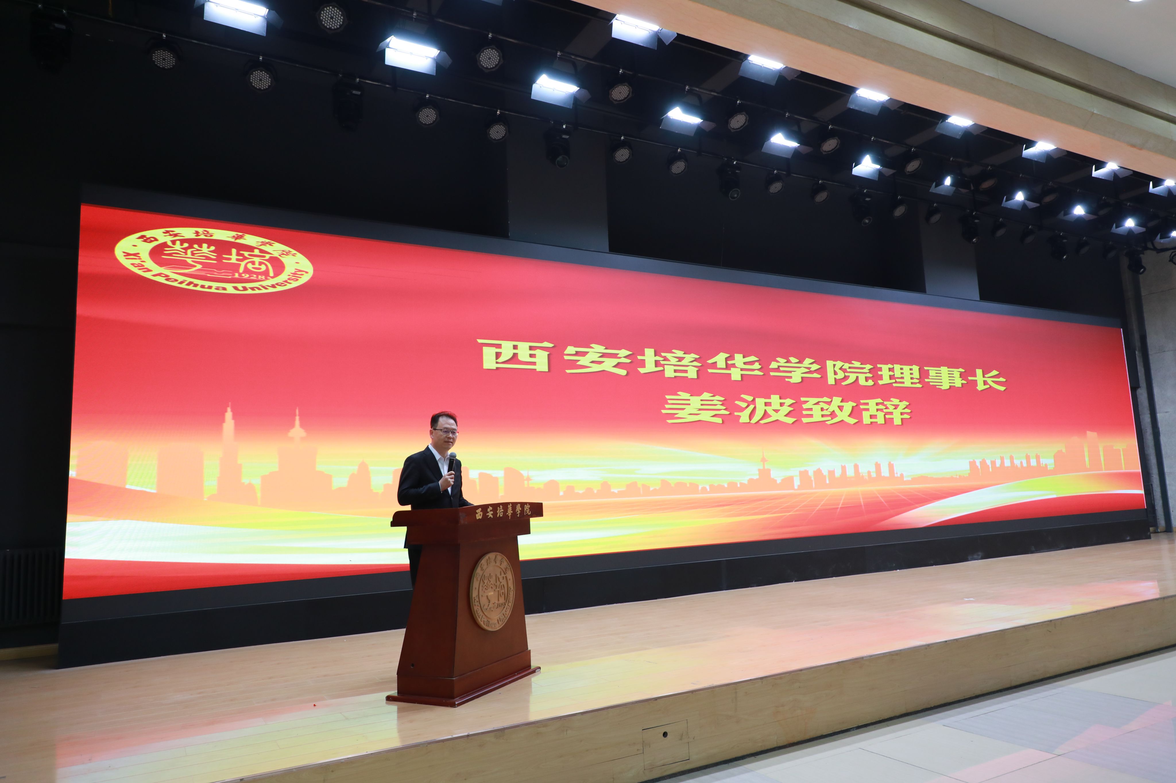 西安培华学院理事长姜波博士致辞。理事长介绍了学校发展历程中,为助力大西北全面建设,缓解经济工作对金融人才的急需所开启的对财经、金融人才的培养工作。他期望通过"培华杯"第二届金融文化节系列活动的开展,持续推进我校财金人才的高质量培养,深入探索金融文化的传播、金融法治的建设、金融事业的发展之路。