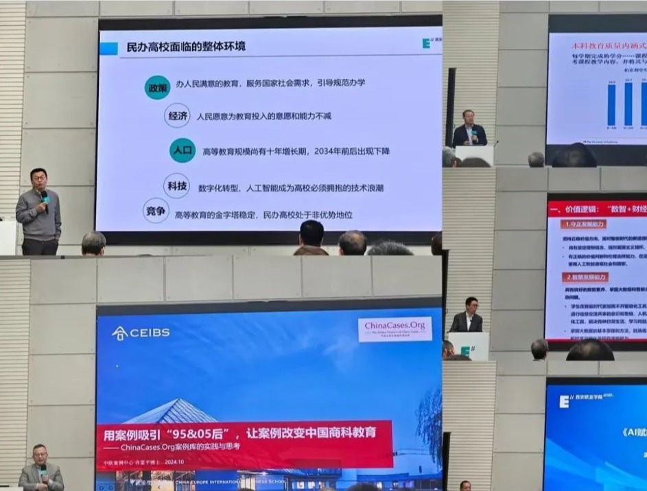 接下来,西安欧亚学院创办人、董事长胡建波教授、温州商学院执行校长赵玻教授、广州华商学院校长助理张军教授、美国加州大学常桐善教授和中欧国际工商学院案例中心助理主任许雷平博士分别做了主题报告。五位专家分别从我国人口基数、政策和外部环境的变化趋势、人工智能对于传统教学和管理方式的影响、“数字+财经”人才培养的实践探索、利用大数据指导课程建设和教育教学以及通过案例提升教学效果几个方面进行深度全面汇报和政策解读,探讨民办院校如何办出好大学、办出有特色的大学的生存发展路径。