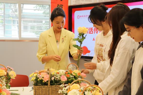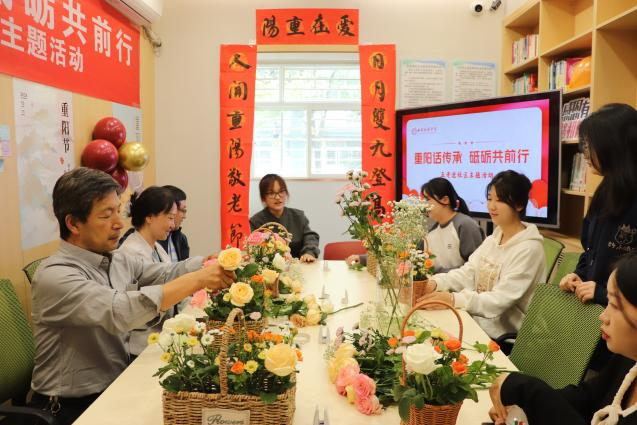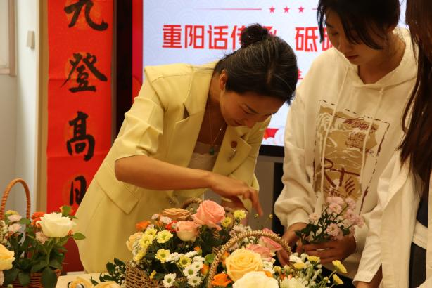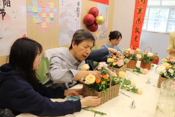 活动伊始,重阳插花环节为整个活动增添了一抹温馨与艺术的气息。学生们与各位老师围坐在一起,精心挑选着娇艳的花朵,修剪枝叶、巧妙搭配。姚文静校长与老教师们一同参与插花活动,他们巧手翻飞,将一朵朵娇艳的鲜花巧妙组合,创造出一个个充满艺术感的花艺作品。插花活动不仅展现了艺术之美,更在轻松愉快的氛围中拉近了老师与学生之间的距离。