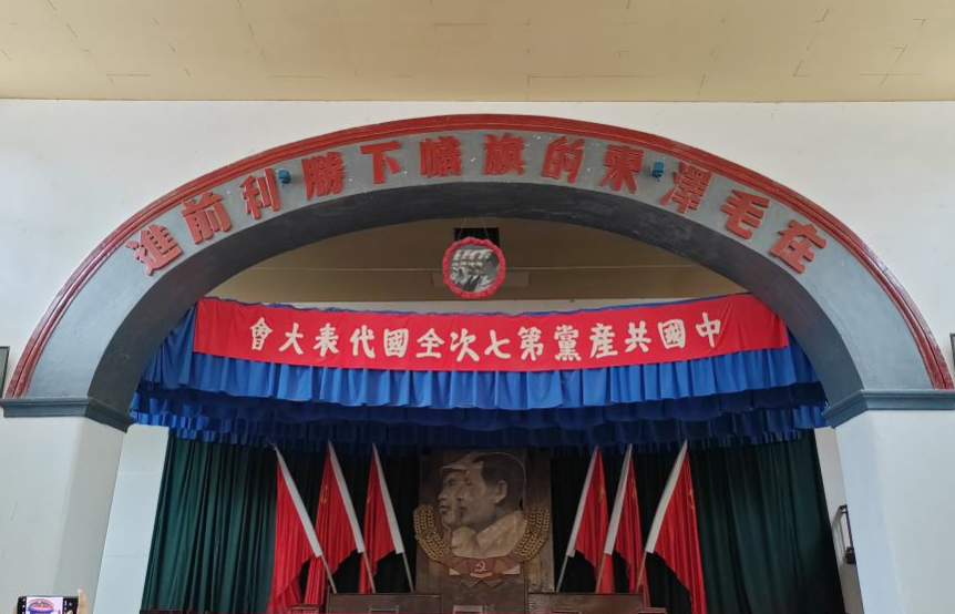 走进中央大礼堂,里面的陈设仍然保持着66年前的风貌。主席台正中是毛泽东、朱德的巨幅画像;会场后面墙上,悬挂着“同心同德”4个大字;两侧墙上悬挂4幅“坚持真理”“修正错误”标语;靠墙边插着24面红旗,象征着中国共产党24年奋斗的历程;插红旗的“V”字形木座是革命胜利的标志;在主席台的正上方,悬挂着一条引人注目的横幅:“在毛泽东的旗帜下胜利前进!”