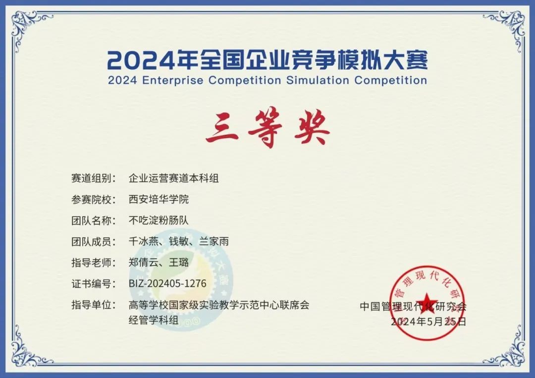 本次大赛自3月25日开始,经过初赛、复赛、半决赛、总决赛,于6月1日结束。本届大赛共计581所高校的6632支队伍入围全国复赛。经过激烈比拼, 我校会计与金融学院4支队伍荣获企业竞争模拟大赛全国一等奖1项和三等奖3项。赛项重在考察参赛团队的企业战略规划能力、人力资源分析能力以及成本核算和财务管理等基本素养,检验学生应变能力以及分析问题和动手解决问题的能力。