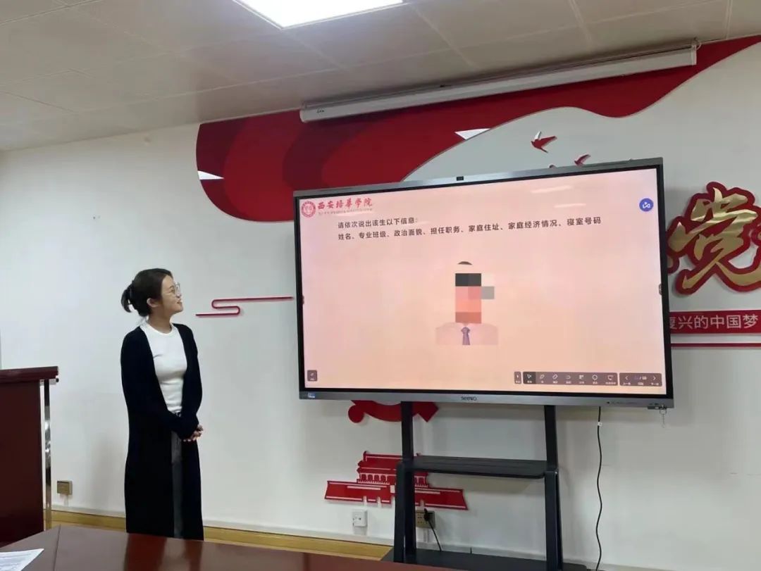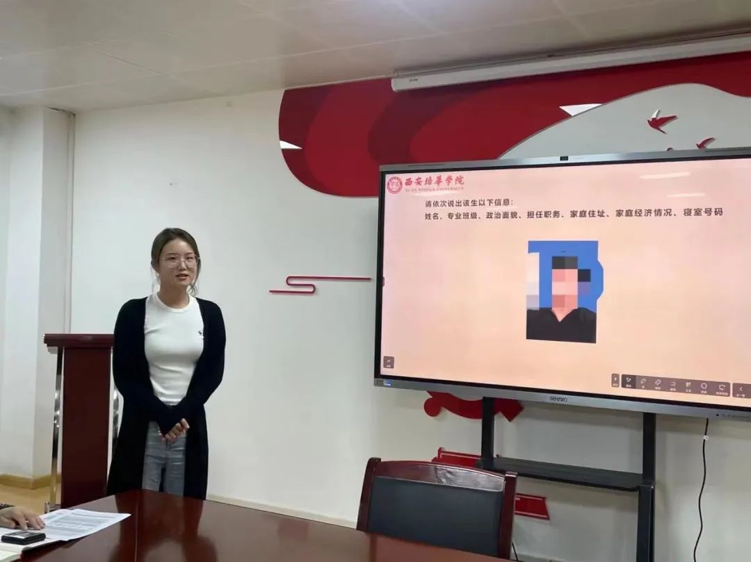 本周进行“学情熟知”测试环节的辅导员是李梦丽老师。依照辅导员素质能力大赛的要求,随机抽取所带学生的照片,李老师需要进行图像识别,并准确说出学生的姓名、专业班级、政治面貌、担任职务、家庭住址、家庭经济情况、寝室号码等7条基本信息。辅导员准确掌握学生情况,有利于针对学生开展个性化教育和引导,与学生进行更为有效地沟通,从而建立师生互信关系,增加辅导员与学生之间的黏性。