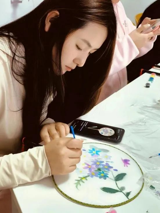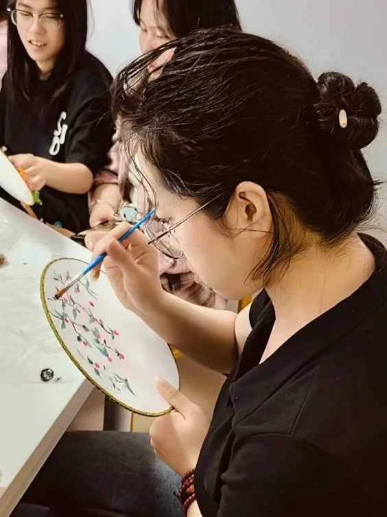 一把空白团扇,一瓶胶水,一支绘笔,简简单单的工具,同学们仔细的在扇面上绘画着,充分发挥自己的想象制作出各种风格的团扇。在欢声笑语中,一把把“私人订制”的精美团扇精彩亮相。
