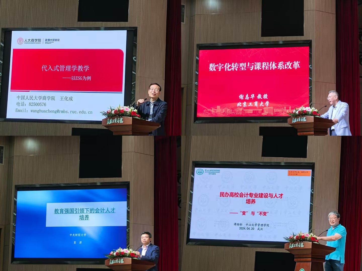 20日上午,会议开幕后,由中国人民大学王化成教授、北京工商大学谢志华教授、中央财经大学袁淳教授和中山大学谭劲松教授分别做了主题演讲。四位教授分别从如何将真实案例与专业教学融合、如何在财会专业数字化转型背景下进行课程体系改革、如何引导会计专业学生树立强国自信以及如何从专业建设和人才培养上融入财会专业的“变”与“不变”发表见解。
