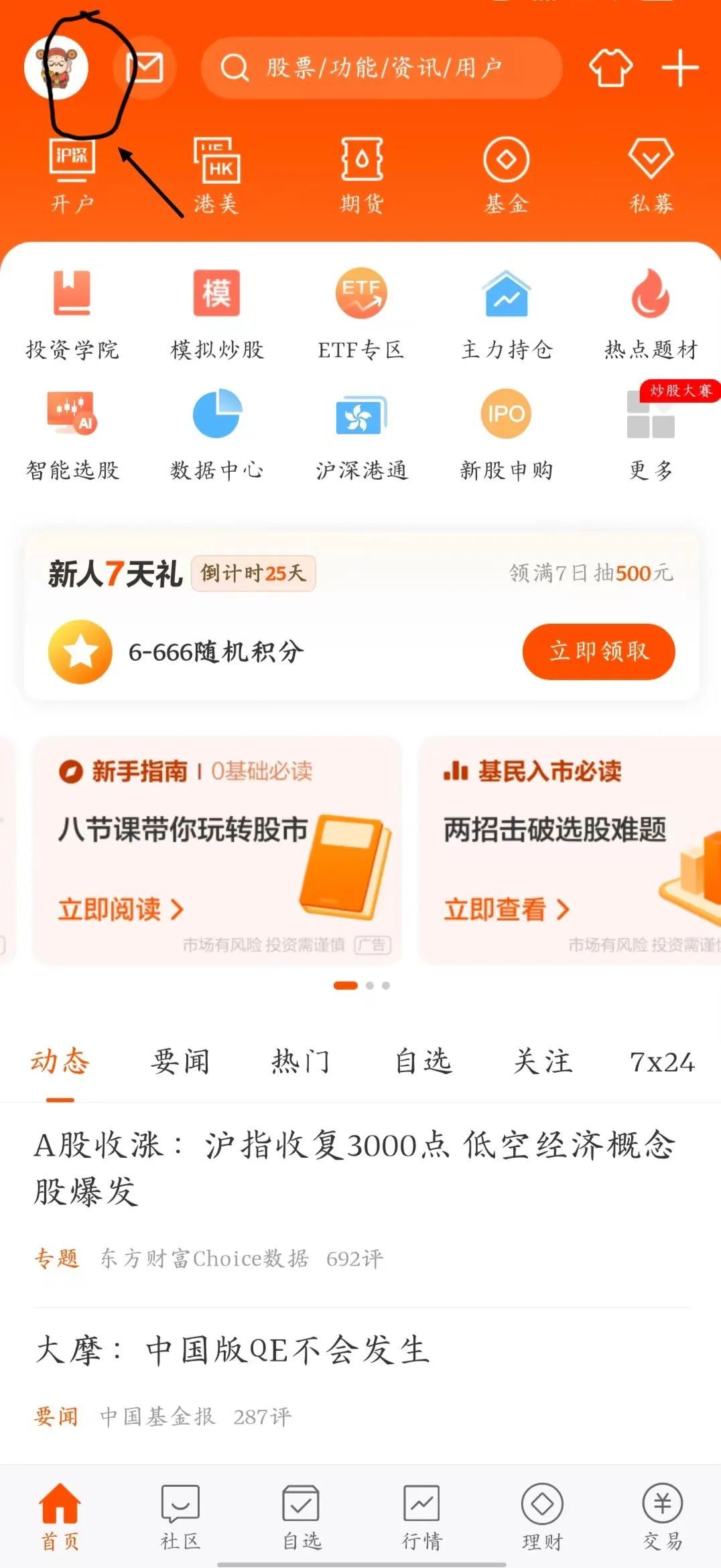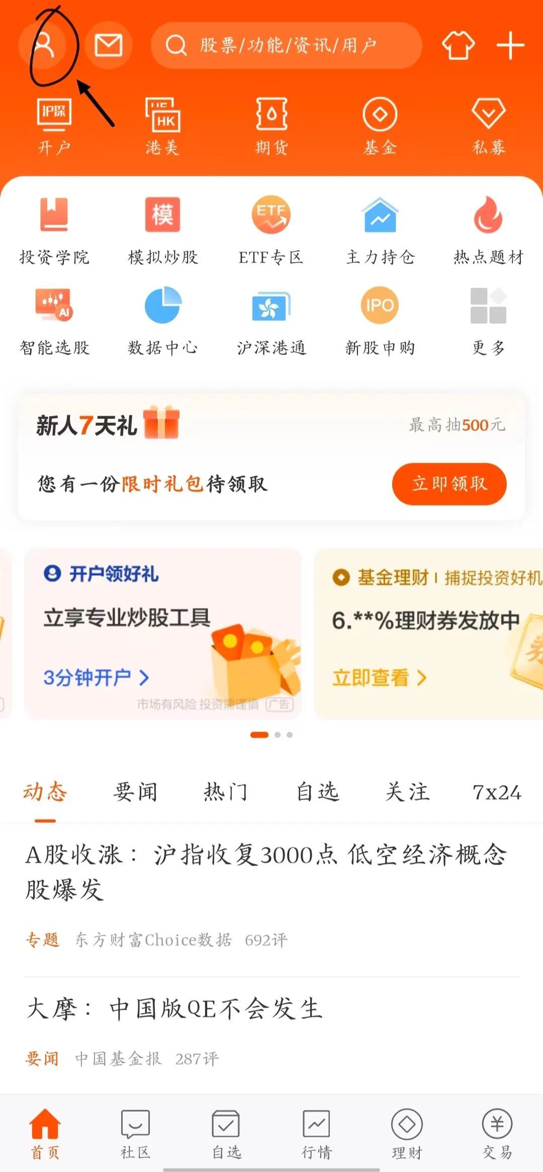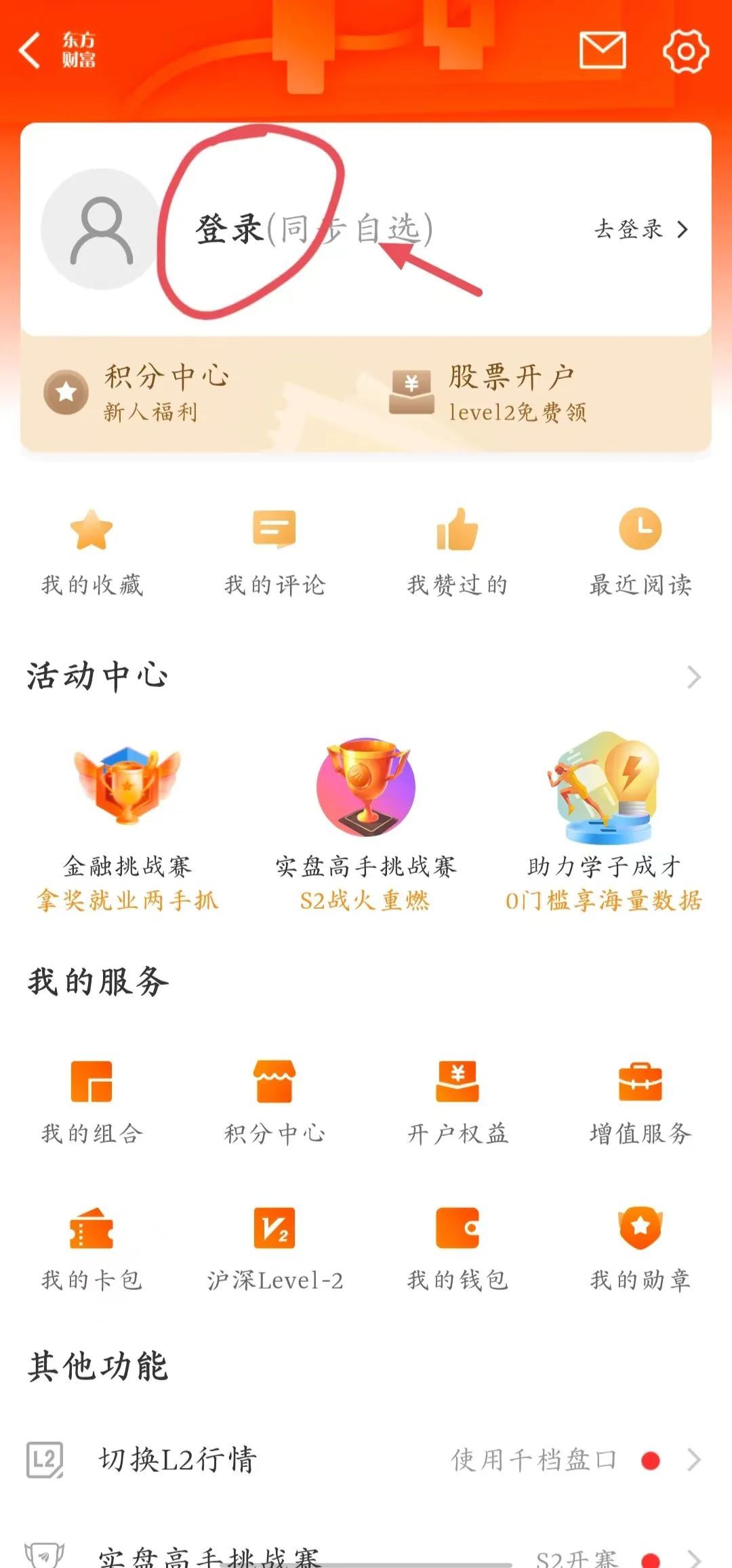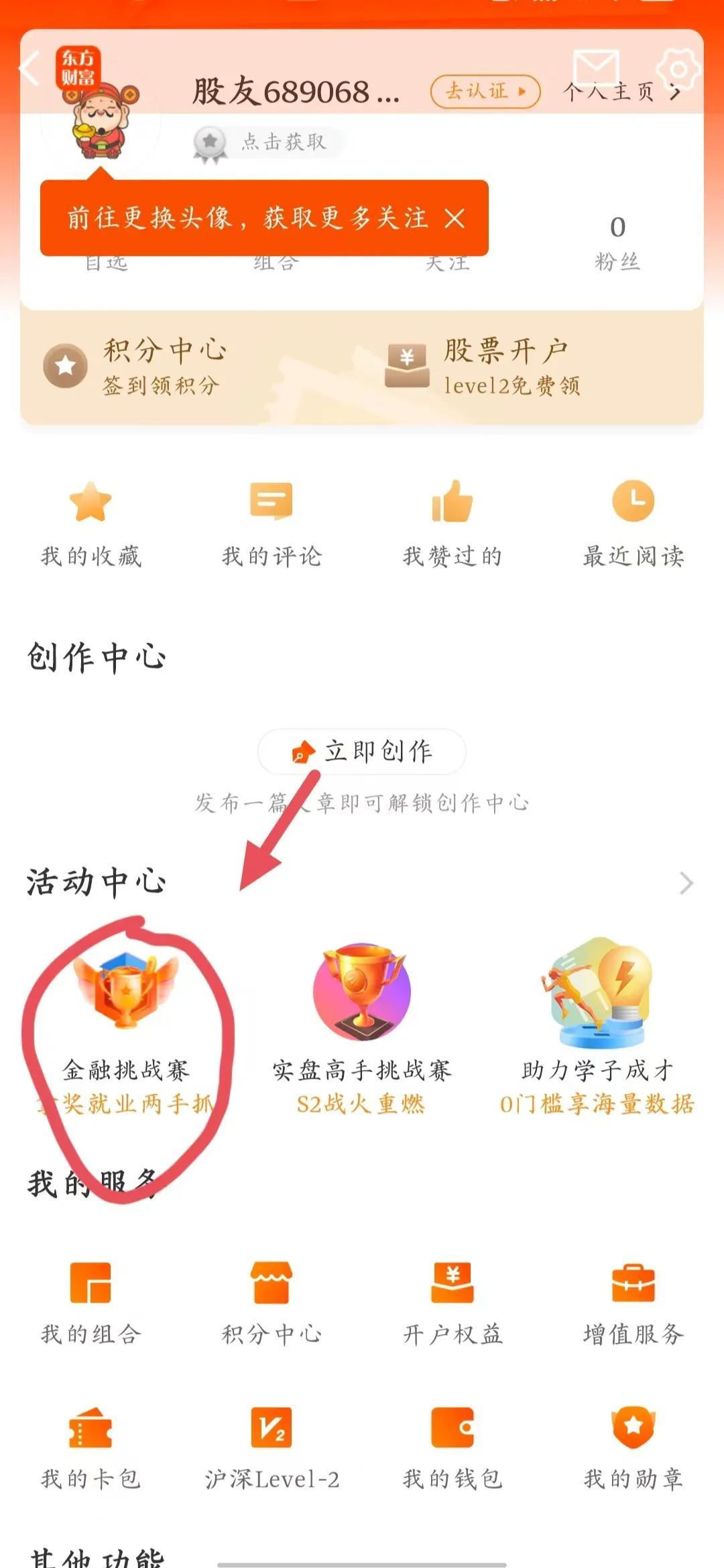 下载“东方财富”APP,首页点击左上角“头像”图标进入“我”页面,选择“金融挑战赛”报名参赛。