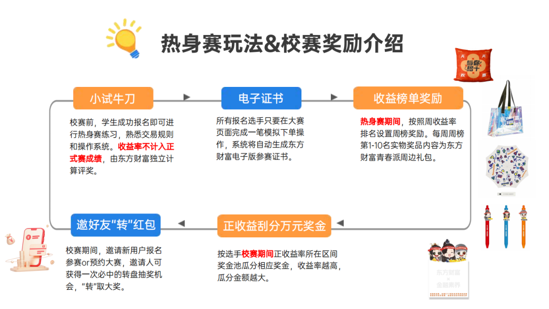 热身赛期间,按照周收益率排名设置周榜奖励。每周周榜前十名将获得最高价值500元的实物奖励!奖品内容为东方财富青春派周边礼包。