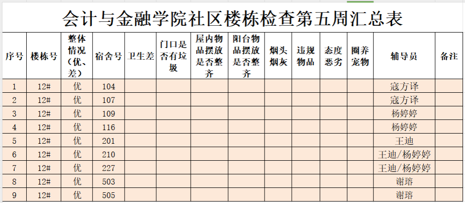 此次检查主要从寝室安全、卫生、整洁度、文化文明四个方面进行考量,旨在排除学生宿舍安全隐患,指导学生清理卫生死角,提高学生归纳整理能力以及文明素养。