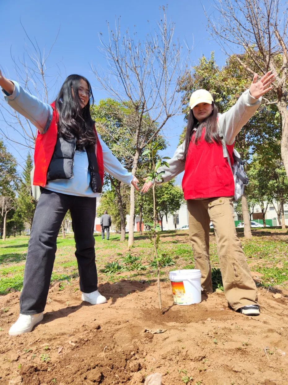 植树现场阳光明媚、微风和煦,同学们精神抖擞、干劲十足、热情高涨,大家严格按照标准挥锹铲土、扶苗填坑、踏土固根,每一滴汗、每一铲土都体现着对绿色的向往、诠释着对大自然的热爱。当一排排整齐的树苗在春风中落地生根、迎风而立,焕发出盎然生机,也意味着青年志愿者们为西安培华学院又增添了一抹绿的色彩、贡献了一份青春力量。